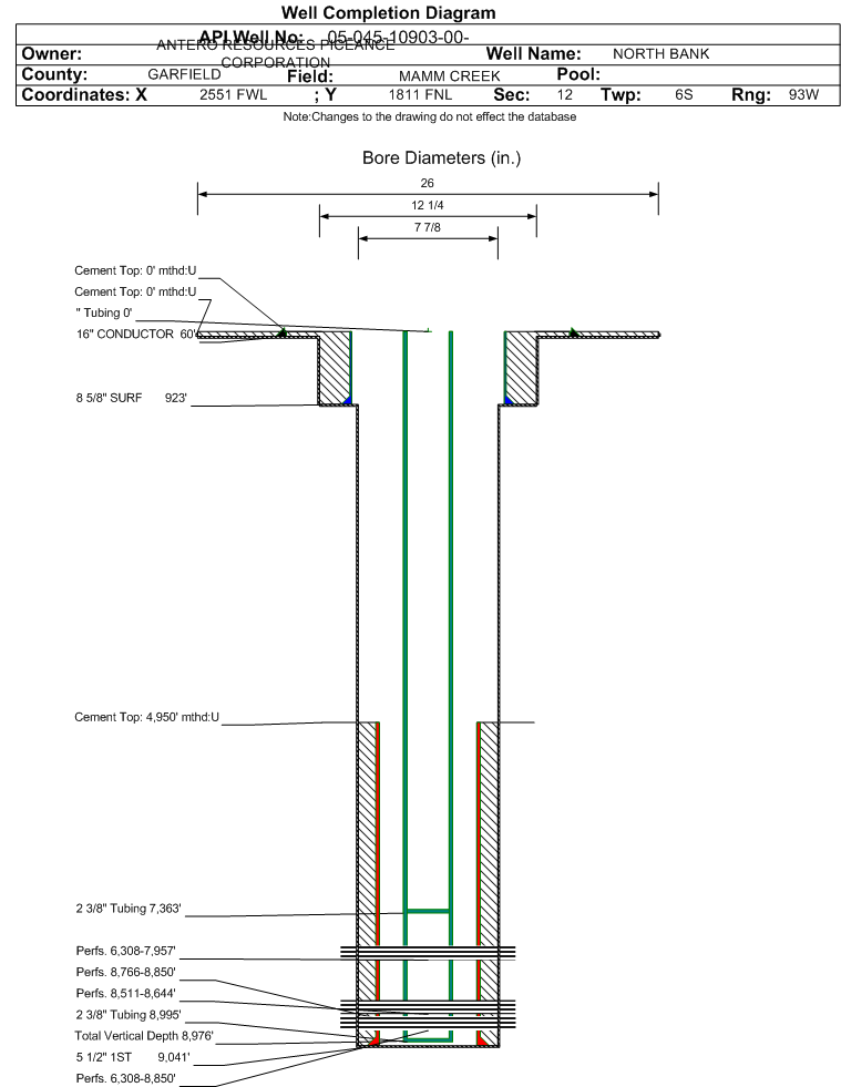 | Wellbore Completed | | Completion Date: | 5/21/2006 | | Spud Date: | 4/16/2006 | Spud Date Is: | ACTUAL | | Measured TD: | 9050 ft. | Measured PB depth: | 8995 ft. | | True Vertical TD: | 8976 ft. | True Vertical PB depth: | 8921 ft. | | Top PZ Location: | Sec:12 Twp: 6S 93W | Footage: 2318 FNL 2006 FEL | | Bottom Hole Location: | Sec:12 Twp: 6S 93W | Footage: 2318 FNL 2006 FEL | | Log Types: | TRIPLE COMBO-IND/NEUT/DENS, CBL, TEMPERATURE LOG | | Casing: | String Type: CONDUCTOR, Hole Size: 26 in., Size: 16 in., Top: 0 ft., Depth: 60 ft., Weight: , Citings Type: ACTUAL | | Cement: | Sacks: 225, Top: 0 ft., Bottom: 60 ft., Determination Method: CALC | | Casing: | String Type: SURF, Hole Size: 12.25 in., Size: 8.625 in., Top: 0 ft., Depth: 923 ft., Weight: , Citings Type: ACTUAL | | Cement: | Sacks: 395, Top: 0 ft., Bottom: 923 ft., Determination Method: CALC | | Casing: | String Type: 1ST, Hole Size: 7.875 in., Size: 5.5 in., Top: 4950 ft., Depth: 9041 ft., Weight: , Citings Type: ACTUAL | | Cement: | Sacks: 772, Top: 4950 ft., Bottom: 9041 ft., Determination Method: CBL | | Formation | Interval Top | Log Bottom | Cored | DSTs | | MESAVERDE | 4294 ft. | | N | N | | WILLIAMS FORK | 4294 ft. | | N | N | | CAMEO | 6960 ft. | | N | N | | ROLLINS | 7966 ft. | | N | N | | COZZETTE | 8497 ft. | | N | N | | CORCORAN | 8767 ft. | | N | N |