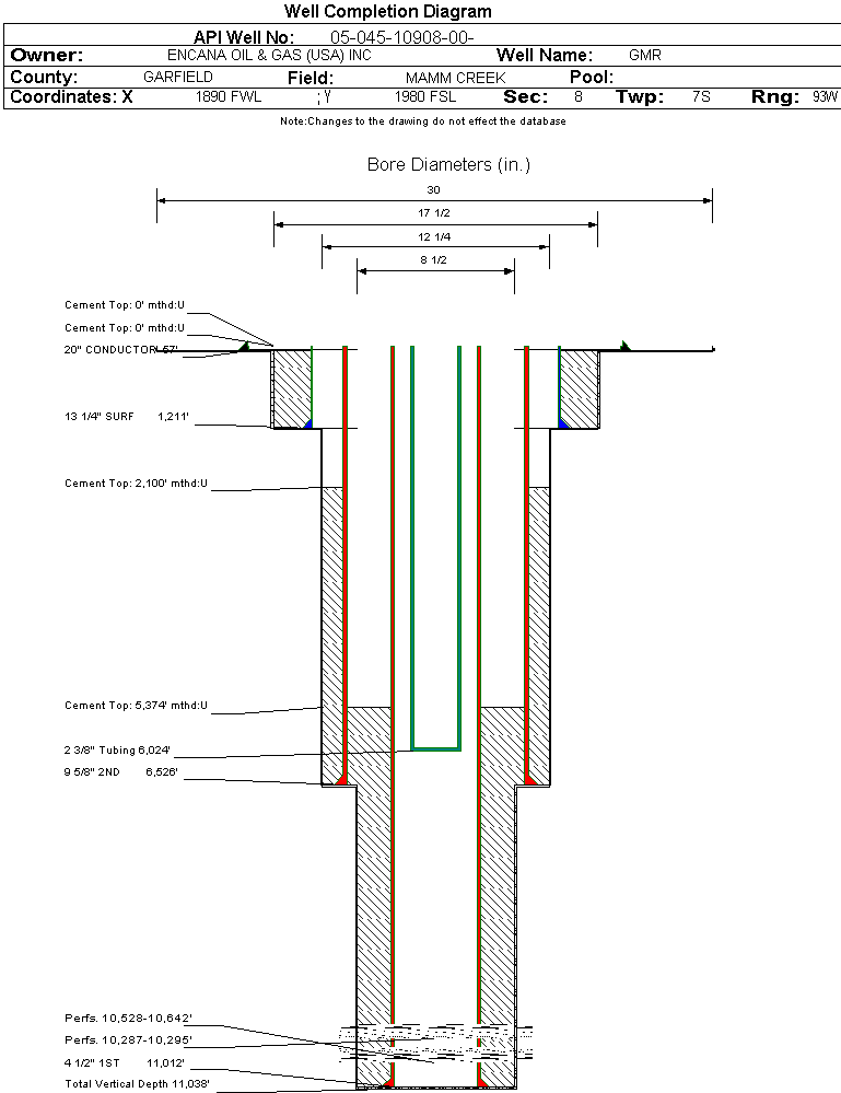 | Wellbore Completed | | Completion Date: | 11/3/2005 | | Spud Date: | 8/3/2005 | Spud Date Is: | ACTUAL | | Measured TD: | 11056 ft. | Measured PB depth: | 10340 ft. | | True Vertical TD: | 11038 ft. | True Vertical PB depth: | | | Log Types: | BOND LOG, PEX, CBL/GR/TEMP | | Casing: | String Type: CONDUCTOR, Hole Size: 30 in., Size: 20 in., Top: 0 ft., Depth: 57 ft., Weight: , Citings Type: ACTUAL | | Cement: | Sacks: , Top: 0 ft., Bottom: 40 ft., Determination Method: CALC | | Casing: | String Type: SURF, Hole Size: 17.5 in., Size: 13.3125 in., Top: 0 ft., Depth: 1211 ft., Weight: , Citings Type: ACTUAL | | Cement: | Sacks: 843, Top: 0 ft., Bottom: 1220 ft., Determination Method: CALC | | Casing: | String Type: 1ST, Hole Size: 8.5 in., Size: 4.5 in., Top: 0 ft., Depth: 11012 ft., Weight: , Citings Type: ACTUAL | | Cement: | Sacks: 1120, Top: 5374 ft., Bottom: 11012 ft., Determination Method: CBL | | Casing: | String Type: 2ND, Hole Size: 12.25 in., Size: 9.625 in., Top: 0 ft., Depth: 6526 ft., Weight: , Citings Type: ACTUAL | | Cement: | Sacks: 2390, Top: 2100 ft., Bottom: 6535 ft., Determination Method: CBL | | Formation | Interval Top | Log Bottom | Cored | DSTs | | WASATCH | 0 ft. | | N | N | | WILLIAMS FORK | 6789 ft. | | N | N | | ROLLINS | 9839 ft. | | N | N | | COZZETTE | 10280 ft. | | N | N | | CORCORAN | 10506 ft. | | N | N |