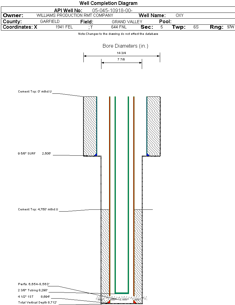 Wellbore #00 Wellbore Classification: GW Status: PR - 1/1/2006 Measured TD: 8712 ft.| Wellbore Data for Original Wellbore | Wellbore Classification: GW PR - 1/1/2006 | | Wellbore Permit | | | Permit #: | 20051984 | Expiration Date: | 7/5/2006 | | Proposed Depth/Form: | 8773 ft. | | Surface Mineral Owner Same: | Yes | | Mineral Owner: | FEE | Surface Owner: | FEE | | Unit: | | Unit Number: | | | Formation And Spacing: | Code: WMFK , Formation: WILLIAMS FORK , Order: , Unit Acreage: , Drill Unit: |