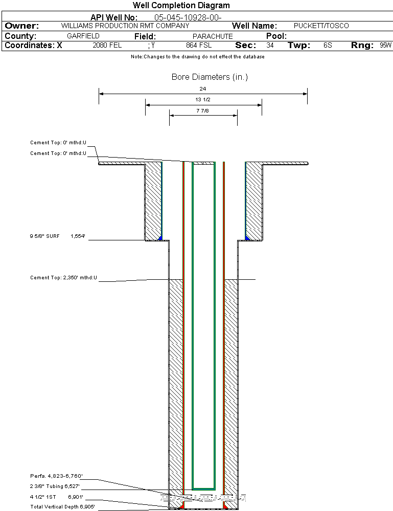 Wellbore #00 Wellbore Classification: GW Status: PR - 1/25/2006 Measured TD: 6937 ft. Vertical TD: 6905 ft.| Wellbore Data for Original Wellbore | Wellbore Classification: GW PR - 1/25/2006 | | Wellbore Permit | DIRECTIONAL | | Permit #: | 20052048 | Expiration Date: | 7/11/2006 | | Proposed Top PZ Location: | Sec: Twp: | Footage: 548 FSL 1670 FEL | | Bottom Hole Location: | Sec: Twp: | Footage: 548 FSL 1670 FEL | | Proposed Depth/Form: | 7000 ft. | | Surface Mineral Owner Same: | Yes | | Mineral Owner: | FEE | Surface Owner: | FEE | | Unit: | | Unit Number: | | | Formation And Spacing: | Code: WMFK , Formation: WILLIAMS FORK , Order: 139-38 , Unit Acreage: 320, Drill Unit: S2 |