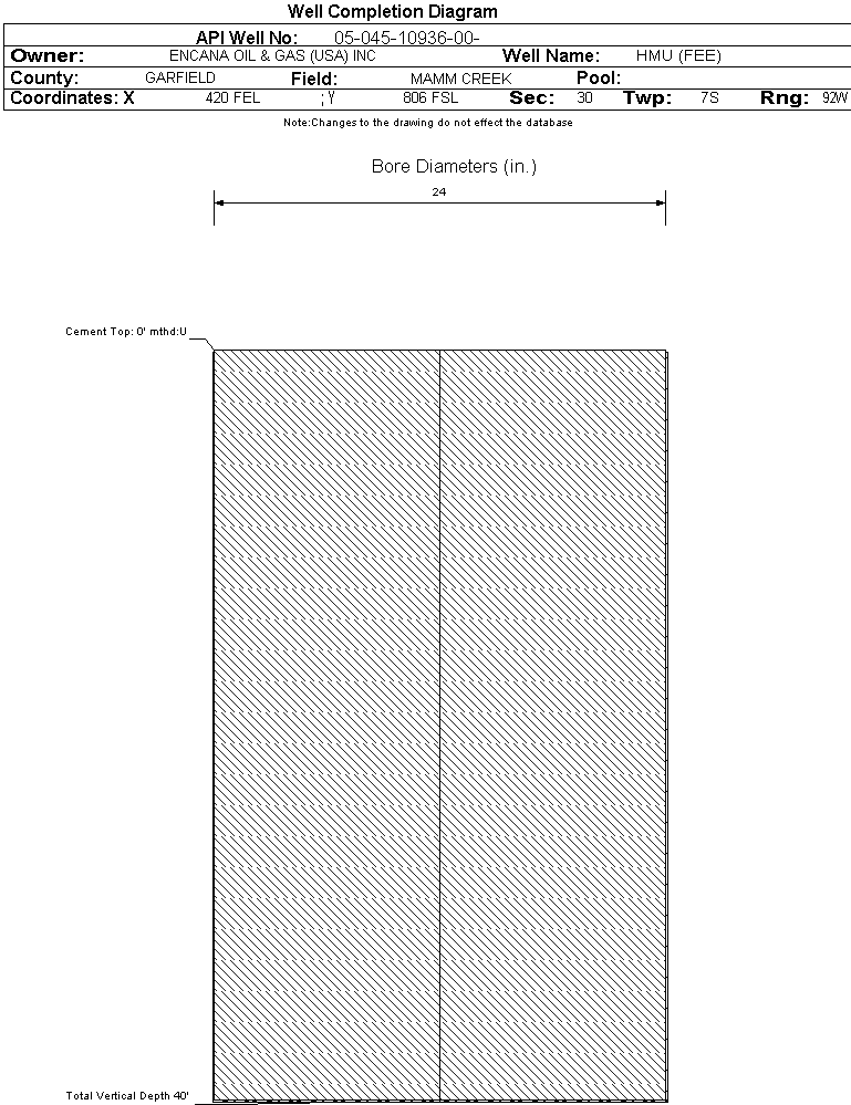 Wellbore #00 Wellbore Classification: DA Status: PA - 8/26/2005 Measured TD: 40 ft. Vertical TD: 40 ft.| Wellbore Data for Original Wellbore | Wellbore Classification: DA PA - 8/26/2005 | | Wellbore Permit | DIRECTIONAL | | Permit #: | 20052057 | Expiration Date: | 7/13/2006 | | Proposed Top PZ Location: | Sec:29 Twp: 7S 92W | Footage: 1273 FSL 1310 FWL | | Bottom Hole Location: | Sec:29 Twp: 7S 92W | Footage: 1273 FSL 1310 FWL | | Proposed Depth/Form: | 8174 ft. | | Surface Mineral Owner Same: | No | | Mineral Owner: | FEE | Surface Owner: | FEDERAL | | Unit: | HUNTER MESA | Unit Number: | COC 55972X | | Formation And Spacing: | Code: ILES , Formation: ILES , Order: , Unit Acreage: , Drill Unit: | | Formation And Spacing: | Code: WMFK , Formation: WILLIAMS FORK , Order: , Unit Acreage: , Drill Unit: | | Casing: | String Type: CONDUCTOR, Hole Size: 24 in., Size: 16 in., Top: , Depth: 40 ft., Weight: , Citings Type: PLANNED | | Cement: | Sacks: 5, Top: 0 ft., Bottom: 40 ft. | | Casing: | String Type: SURF, Hole Size: 12.25 in., Size: 8.625 in., Top: , Depth: 1000 ft., Weight: 32 , Citings Type: PLANNED | | Cement: | Sacks: 710, Top: 0 ft., Bottom: 1000 ft. | | Casing: | String Type: 1ST, Hole Size: 7.875 in., Size: 4.5 in., Top: , Depth: 8174 ft., Weight: 11.6 , Citings Type: PLANNED | | Cement: | Sacks: 610, Top: 500 ft., Bottom: 8174 ft. |