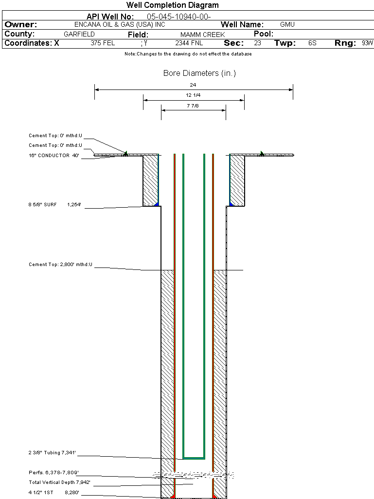 | Wellbore Completed | | Completion Date: | 9/6/2005 | | Spud Date: | 7/28/2005 | Spud Date Is: | ACTUAL | | Measured TD: | 8280 ft. | Measured PB depth: | 8060 ft. | | True Vertical TD: | 7942 ft. | True Vertical PB depth: | 0 ft. | | Top PZ Location: | Sec:23 Twp: 6S 93W | Footage: 1317 FNL 1985 FEL | | Bottom Hole Location: | Sec:23 Twp: 6S 93W | Footage: 1317 FNL 1985 FEL | | Log Types: | PEX/AI/GR; CBL | | Casing: | String Type: CONDUCTOR, Hole Size: 24 in., Size: 16 in., Top: 0 ft., Depth: 40 ft., Weight: , Citings Type: ACTUAL | | Cement: | Sacks: 4, Top: 0 ft., Bottom: 40 ft., Determination Method: CALC | | Casing: | String Type: SURF, Hole Size: 12.25 in., Size: 8.625 in., Top: 0 ft., Depth: 1254 ft., Weight: , Citings Type: ACTUAL | | Cement: | Sacks: 870, Top: 0 ft., Bottom: 1254 ft., Determination Method: CALC | | Casing: | String Type: 1ST, Hole Size: 7.875 in., Size: 4.5 in., Top: 0 ft., Depth: 8280 ft., Weight: , Citings Type: ACTUAL | | Cement: | Sacks: 1590, Top: 2800 ft., Bottom: 8280 ft., Determination Method: CBL | | Formation | Interval Top | Log Bottom | Cored | DSTs | | WASATCH | 0 ft. | 4984 ft. | N | N | | WILLIAMS FORK | 4985 ft. | 8144 ft. | N | N | | ROLLINS | 8145 ft. | | N | N |