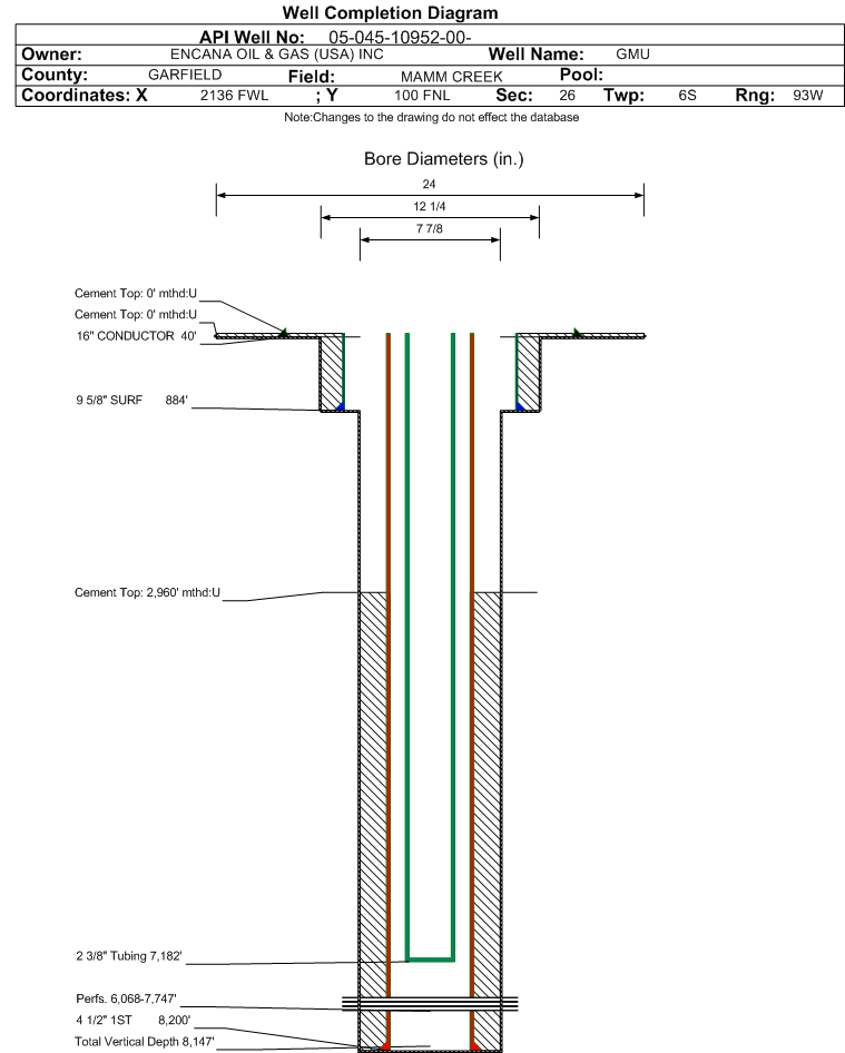 | Wellbore Completed | | Completion Date: | 8/5/2008 | | Spud Date: | 7/23/2008 | Spud Date Is: | ACTUAL | | Measured TD: | 8200 ft. | Measured PB depth: | 8048 ft. | | True Vertical TD: | 8147 ft. | True Vertical PB depth: | 7995 ft. | | Top PZ Location: | Sec:23 Twp: 6S 93W | Footage: 634 FSL 1987 FWL | | Bottom Hole Location: | Sec:23 Twp: 6S 93W | Footage: 634 FSL 1987 FWL | | Log Types: | RST - CBL | | Casing: | String Type: CONDUCTOR, Hole Size: 24 in., Size: 16 in., Top: 0 ft., Depth: 40 ft., Weight: , Citings Type: ACTUAL | | Cement: | Sacks: , Top: 0 ft., Bottom: 40 ft., Determination Method: | | Casing: | String Type: SURF, Hole Size: 12.25 in., Size: 9.625 in., Top: 0 ft., Depth: 884 ft., Weight: , Citings Type: ACTUAL | | Cement: | Sacks: 319, Top: 0 ft., Bottom: 884 ft., Determination Method: | | Casing: | String Type: 1ST, Hole Size: 7.875 in., Size: 4.5 in., Top: 0 ft., Depth: 8200 ft., Weight: , Citings Type: ACTUAL | | Cement: | Sacks: 1310, Top: 2960 ft., Bottom: 8200 ft., Determination Method: CBL | | Formation | Interval Top | Log Bottom | Cored | DSTs | | WASATCH | 0 ft. | 5063 ft. | N | N | | WILLIAMS FORK | 5063 ft. | 8086 ft. | N | N | | ROLLINS | 8086 ft. | 8200 ft. | N | N |