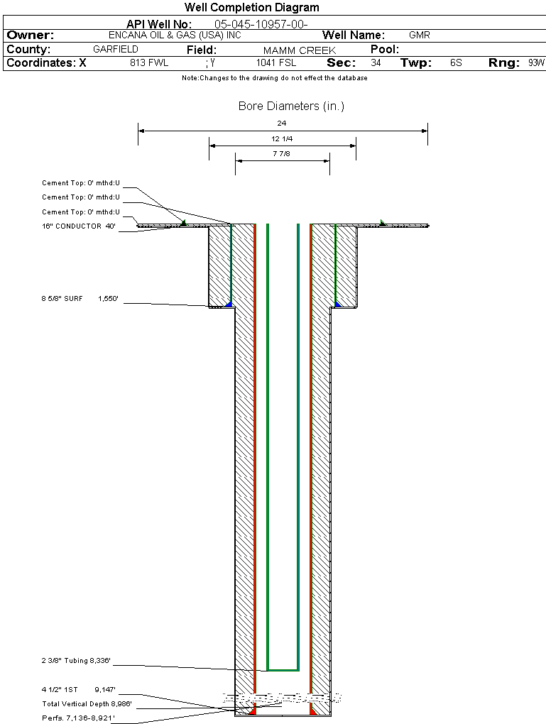 | Wellbore Completed | | Completion Date: | 11/13/2005 | | Spud Date: | 8/19/2005 | Spud Date Is: | ACTUAL | | Measured TD: | 9147 ft. | Measured PB depth: | 9072 ft. | | True Vertical TD: | 8986 ft. | True Vertical PB depth: | | | Top PZ Location: | Sec:34 Twp: 6S 93W | Footage: 1355 FSL 2180 FWL | | Bottom Hole Location: | Sec:34 Twp: 6S 93W | Footage: 1355 FSL 2180 FWL | | Log Types: | CBL/GR/CCL, PEX-AI/GR/SP, RST | | Casing: | String Type: CONDUCTOR, Hole Size: 24 in., Size: 16 in., Top: , Depth: 40 ft., Weight: , Citings Type: ACTUAL | | Cement: | Sacks: , Top: 0 ft., Bottom: 40 ft., Determination Method: CALC | | Casing: | String Type: SURF, Hole Size: 12.25 in., Size: 8.625 in., Top: 0 ft., Depth: 1550 ft., Weight: , Citings Type: ACTUAL | | Cement: | Sacks: 1080, Top: 0 ft., Bottom: 1550 ft., Determination Method: CALC | | Casing: | String Type: 1ST, Hole Size: 7.875 in., Size: 4.5 in., Top: 0 ft., Depth: 9147 ft., Weight: , Citings Type: ACTUAL | | Cement: | Sacks: 1775, Top: 0 ft., Bottom: 9147 ft., Determination Method: CBL | | Formation | Interval Top | Log Bottom | Cored | DSTs | | WASATCH | 0 ft. | 5987 ft. | N | N | | WILLIAMS FORK | 5988 ft. | 9015 ft. | N | N | | ROLLINS | 9016 ft. | | N | N |
