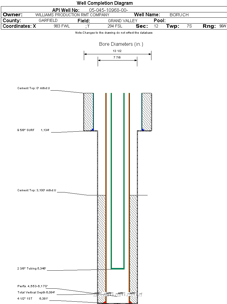 | Wellbore Completed | | Completion Date: | 3/18/2006 | | Spud Date: | 3/9/2006 | Spud Date Is: | ACTUAL | | Measured TD: | 6375 ft. | Measured PB depth: | 6270 ft. | | True Vertical TD: | 6084 ft. | True Vertical PB depth: | | | Top PZ Location: | Sec:12 Twp: 7S 96W | Footage: 566 FSL 2463 FWL | | Bottom Hole Location: | Sec:12 Twp: 7S 96W | Footage: 566 FSL 2463 FWL | | Log Types: | CBL; RESERVOIR MONITOR TOOL ELITE | | Casing: | String Type: SURF, Hole Size: 13.5 in., Size: 9.625 in., Top: 0 ft., Depth: 1134 ft., Weight: , Citings Type: ACTUAL | | Cement: | Sacks: 375, Top: 0 ft., Bottom: 1134 ft., Determination Method: | | Casing: | String Type: 1ST, Hole Size: 7.875 in., Size: 4.5 in., Top: 0 ft., Depth: 6381 ft., Weight: , Citings Type: ACTUAL | | Cement: | Sacks: 825, Top: 3100 ft., Bottom: 6381 ft., Determination Method: CBL | | Formation | Interval Top | Log Bottom | Cored | DSTs | | WASATCH G | 1142 ft. | | N | N | | FORT UNION | 1597 ft. | | N | N | | MESAVERDE | 3170 ft. | | N | N | | CAMEO | 5797 ft. | | N | N | | ROLLINS | 6226 ft. | | N | N |