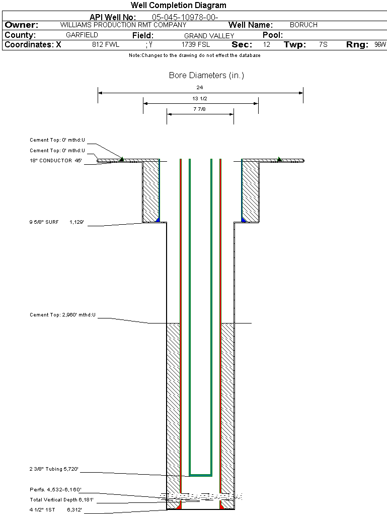 Wellbore #00 Wellbore Classification: GW Status: PR - 4/19/2006 Measured TD: 6312 ft. Vertical TD: 6181 ft.| Wellbore Data for Original Wellbore | Wellbore Classification: GW PR - 4/19/2006 | | Wellbore Permit | DIRECTIONAL | | Permit #: | 20052251 | Expiration Date: | 7/27/2006 | | Proposed Top PZ Location: | Sec: Twp: | Footage: 2597 FSL 1294 FWL | | Bottom Hole Location: | Sec: Twp: | Footage: 2597 FSL 1294 FWL | | Proposed Depth/Form: | 6349 ft. | | Surface Mineral Owner Same: | Yes | | Mineral Owner: | FEE | Surface Owner: | FEE | | Unit: | | Unit Number: | | | Formation And Spacing: | Code: WMFK , Formation: WILLIAMS FORK , Order: 510-12 , Unit Acreage: 320, Drill Unit: W2 |