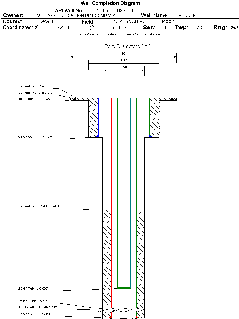 | Wellbore Completed | | Completion Date: | 1/12/2006 | | Spud Date: | 1/3/2006 | Spud Date Is: | ACTUAL | | Measured TD: | 6375 ft. | Measured PB depth: | 6280 ft. | | True Vertical TD: | 6087 ft. | True Vertical PB depth: | | | Top PZ Location: | Sec:11 Twp: 7S 96W | Footage: 725 FSL 2060 FEL | | Bottom Hole Location: | Sec:11 Twp: 7S 96W | Footage: 725 FSL 2060 FEL | | Log Types: | CBL, RESERVOIR MONITOR TOOL ELITE | | Casing: | String Type: CONDUCTOR, Hole Size: 20 in., Size: 18 in., Top: 0 ft., Depth: 45 ft., Weight: , Citings Type: ACTUAL | | Cement: | Sacks: 25, Top: 0 ft., Bottom: 45 ft., Determination Method: | | Casing: | String Type: SURF, Hole Size: 13.5 in., Size: 9.625 in., Top: 0 ft., Depth: 1127 ft., Weight: , Citings Type: ACTUAL | | Cement: | Sacks: 375, Top: 0 ft., Bottom: 1127 ft., Determination Method: | | Casing: | String Type: 1ST, Hole Size: 7.875 in., Size: 4.5 in., Top: 0 ft., Depth: 6368 ft., Weight: , Citings Type: ACTUAL | | Cement: | Sacks: 800, Top: 3240 ft., Bottom: 6368 ft., Determination Method: CBL | | Formation | Interval Top | Log Bottom | Cored | DSTs | | WASATCH G | 1403 ft. | | N | N | | FORT UNION | 1770 ft. | | N | N | | MESAVERDE | 3282 ft. | | N | N | | CAMEO | 5780 ft. | | N | N | | ROLLINS | 6281 ft. | | N | N |