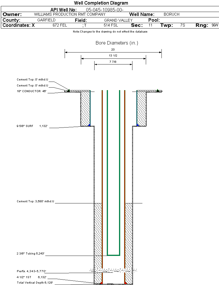 | Wellbore Completed | | Completion Date: | 12/24/2005 | | Spud Date: | 12/17/2005 | Spud Date Is: | ACTUAL | | Measured TD: | 6131 ft. | Measured PB depth: | 6107 ft. | | True Vertical TD: | 6128 ft. | True Vertical PB depth: | | | Top PZ Location: | Sec:11 Twp: 7S 96W | Footage: 572 FSL 560 FEL | | Bottom Hole Location: | Sec:11 Twp: 7S 96W | Footage: 572 FSL 560 FEL | | Log Types: | CBL; RESERVOIR MONITOR TOOL ELITE | | Casing: | String Type: CONDUCTOR, Hole Size: 20 in., Size: 18 in., Top: 0 ft., Depth: 45 ft., Weight: , Citings Type: ACTUAL | | Cement: | Sacks: 25, Top: 0 ft., Bottom: 45 ft., Determination Method: | | Casing: | String Type: SURF, Hole Size: 13.5 in., Size: 9.625 in., Top: 0 ft., Depth: 1132 ft., Weight: , Citings Type: ACTUAL | | Cement: | Sacks: 375, Top: 0 ft., Bottom: 1132 ft., Determination Method: | | Casing: | String Type: 1ST, Hole Size: 7.875 in., Size: 4.5 in., Top: 0 ft., Depth: 6132 ft., Weight: , Citings Type: ACTUAL | | Cement: | Sacks: 810, Top: 3580 ft., Bottom: 6132 ft., Determination Method: CBL | | Formation | Interval Top | Log Bottom | Cored | DSTs | | WASATCH G | 1352 ft. | | N | N | | FORT UNION | 1651 ft. | | N | N | | MESAVERDE | 3081 ft. | | N | N | | CAMEO | 5566 ft. | | N | N | | ROLLINS | 6011 ft. | | N | N |
