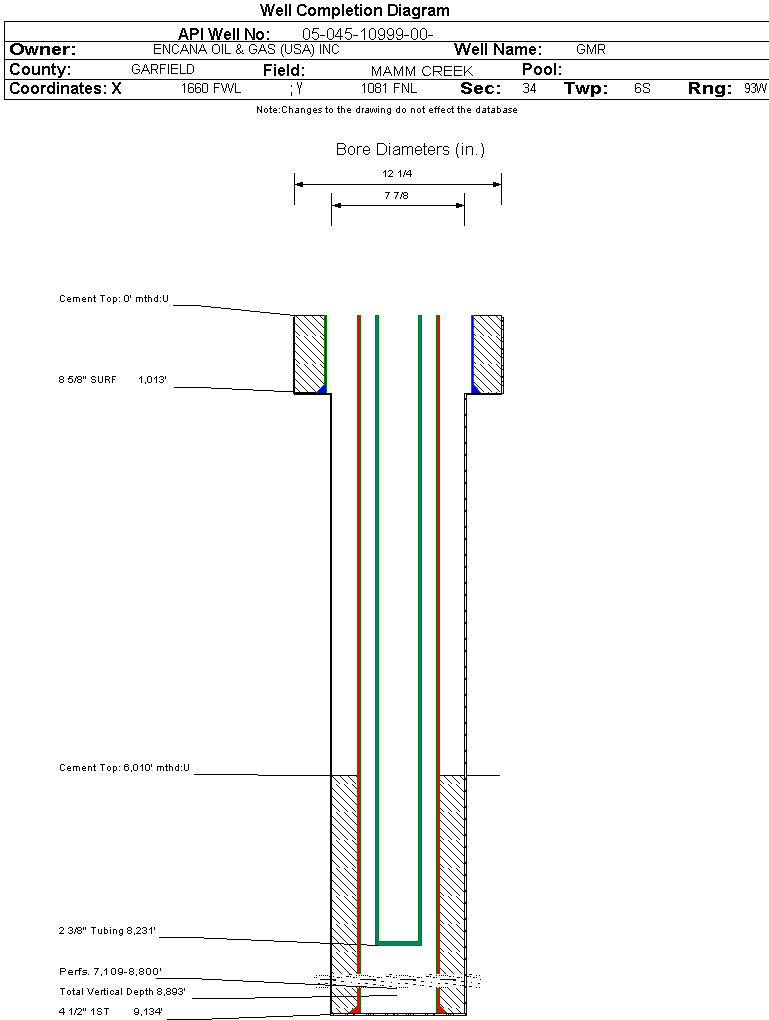 Wellbore #00 Wellbore Classification: GW Status: PR - 10/11/2007 Measured TD: 9145 ft. Vertical TD: 8893 ft.| Wellbore Data for Original Wellbore | Wellbore Classification: GW PR - 10/11/2007 | | Wellbore Permit | DIRECTIONAL | | Permit #: | 20071325 | Expiration Date: | 4/17/2008 | | Proposed Top PZ Location: | Sec: Twp: | Footage: 2630 FSL 2320 FWL | | Bottom Hole Location: | Sec:34 Twp: 6S 93W | Footage: 2630 FSL 2320 FWL | | Proposed Depth/Form: | 9257 ft. | | Surface Mineral Owner Same: | No | | Mineral Owner: | FEE | Surface Owner: | FEE | | Unit: | GRASS MESA | Unit Number: | COC 56608X | | Formation And Spacing: | Code: ILES , Formation: ILES , Order: , Unit Acreage: , Drill Unit: | | Formation And Spacing: | Code: WMFK , Formation: WILLIAMS FORK , Order: , Unit Acreage: , Drill Unit: | | Casing: | String Type: CONDUCTOR, Hole Size: 24 in., Size: 16 in., Top: , Depth: 40 ft., Weight: , Citings Type: PLANNED | | Cement: | Sacks: , Top: 0 ft., Bottom: 40 ft. |