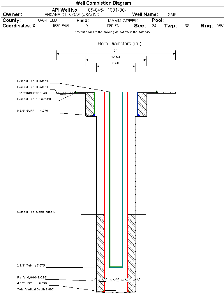 | Wellbore Completed | | Completion Date: | 7/22/2007 | | Spud Date: | 7/1/2007 | Spud Date Is: | ACTUAL | | Measured TD: | 9104 ft. | Measured PB depth: | | | True Vertical TD: | 8996 ft. | True Vertical PB depth: | | | Top PZ Location: | Sec:34 Twp: 6S 93W | Footage: 1940 FNL 2274 FWL | | Bottom Hole Location: | Sec:34 Twp: 6S 93W | Footage: 1940 FNL 2274 FWL | | Log Types: | PEX, CBL/TEMP | | Casing: | String Type: CONDUCTOR, Hole Size: 24 in., Size: 16 in., Top: 0 ft., Depth: 40 ft., Weight: , Citings Type: ACTUAL | | Cement: | Sacks: 4, Top: 0 ft., Bottom: 40 ft., Determination Method: CALC | | Casing: | String Type: SURF, Hole Size: 12.25 in., Size: 8.625 in., Top: 0 ft., Depth: 1079 ft., Weight: , Citings Type: ACTUAL | | Cement: | Sacks: 780, Top: 18 ft., Bottom: 1079 ft., Determination Method: CALC | | Casing: | String Type: 1ST, Hole Size: 7.875 in., Size: 4.5 in., Top: 0 ft., Depth: 9090 ft., Weight: , Citings Type: ACTUAL | | Cement: | Sacks: 635, Top: 5550 ft., Bottom: 9095 ft., Determination Method: CBL | | Casing: | String Type: 2ND, Hole Size: , Size: , Top: 0 ft., Depth: , Weight: , Citings Type: ACTUAL | | Cement: | Sacks: , Top: , Bottom: , Determination Method: | | Casing: | String Type: 3RD, Hole Size: , Size: , Top: 0 ft., Depth: , Weight: , Citings Type: ACTUAL | | Cement: | Sacks: , Top: , Bottom: , Determination Method: | | Formation | Interval Top | Log Bottom | Cored | DSTs | | WASATCH | 0 ft. | 5878 ft. | N | N | | WILLIAMS FORK | 5879 ft. | 8874 ft. | N | N | | ROLLINS | 8875 ft. | 9104 ft. | N | N |