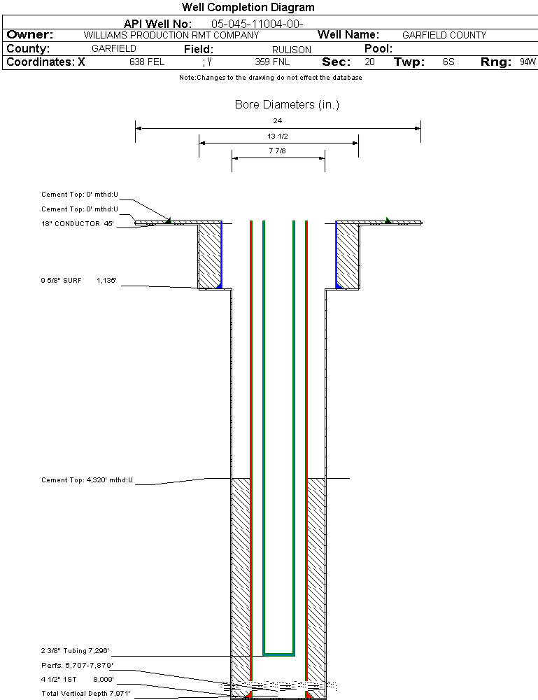 | Wellbore Completed | | Completion Date: | 7/30/2006 | | Spud Date: | 7/15/2006 | Spud Date Is: | ACTUAL | | Measured TD: | 8020 ft. | Measured PB depth: | 7955 ft. | | True Vertical TD: | 7971 ft. | True Vertical PB depth: | | | Top PZ Location: | Sec:20 Twp: 6S 94W | Footage: 955 FNL 316 FEL | | Bottom Hole Location: | Sec:20 Twp: 6S 94W | Footage: 955 FNL 316 FEL | | Log Types: | CBL;HIGH RESOLUTION INDUCTION,SPECTRAL DENSITY,DUAL SPACED NEUTRON | | Casing: | String Type: CONDUCTOR, Hole Size: 24 in., Size: 18 in., Top: 0 ft., Depth: 45 ft., Weight: , Citings Type: ACTUAL | | Cement: | Sacks: 25, Top: 0 ft., Bottom: 45 ft., Determination Method: | | Casing: | String Type: SURF, Hole Size: 13.5 in., Size: 9.625 in., Top: 0 ft., Depth: 1135 ft., Weight: , Citings Type: ACTUAL | | Cement: | Sacks: 375, Top: 0 ft., Bottom: 1135 ft., Determination Method: CBL | | Casing: | String Type: 1ST, Hole Size: 7.875 in., Size: 4.5 in., Top: 0 ft., Depth: 8009 ft., Weight: , Citings Type: ACTUAL | | Cement: | Sacks: 1023, Top: 4320 ft., Bottom: 8008 ft., Determination Method: CBL | | Formation | Interval Top | Log Bottom | Cored | DSTs | | WASATCH G | 1857 ft. | | N | N | | MESAVERDE | 4318 ft. | | N | N | | CAMEO | 7057 ft. | | N | N | | ROLLINS | 7960 ft. | | N | N |