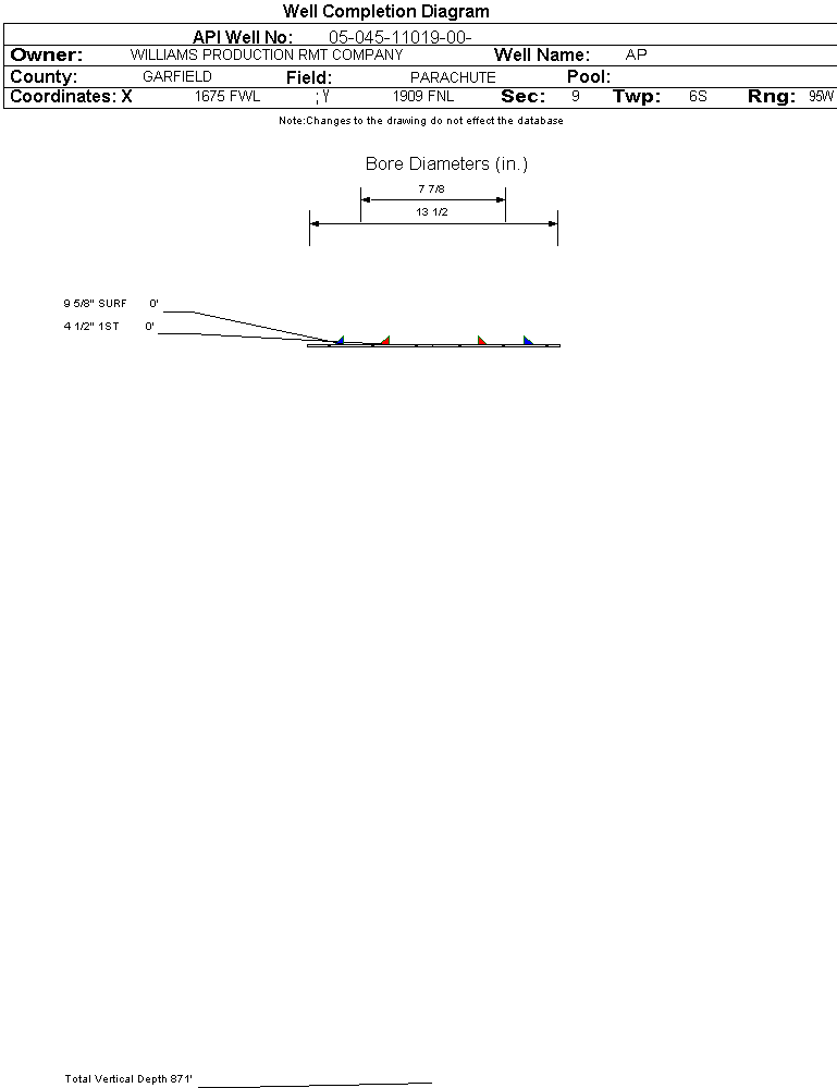 Wellbore #00 Wellbore Classification: GW Status: AB - 6/23/2006 Measured TD: 871 ft.| Wellbore Data for Original Wellbore | Wellbore Classification: GW AB - 6/23/2006 | | Wellbore Permit | | | Permit #: | 20052489 | Expiration Date: | 8/7/2006 | | Proposed Depth/Form: | 11720 ft. | | Surface Mineral Owner Same: | Yes | | Mineral Owner: | FEE | Surface Owner: | FEE | | Unit: | | Unit Number: | | | Formation And Spacing: | Code: WMFK , Formation: WILLIAMS FORK , Order: 440-16 , Unit Acreage: 320, Drill Unit: N2 |