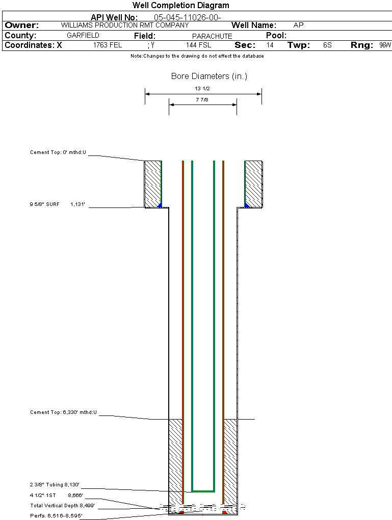 Wellbore #00 Wellbore Classification: GW Status: PR - 1/30/2006 Measured TD: 8706 ft. Vertical TD: 8499 ft.| Wellbore Data for Original Wellbore | Wellbore Classification: GW PR - 1/30/2006 | | Wellbore Permit | DIRECTIONAL | | Permit #: | 20052501 | Expiration Date: | 8/15/2006 | | Proposed Top PZ Location: | Sec:14 Twp: 6S 96W | Footage: 495 FSL 1980 FWL | | Bottom Hole Location: | Sec:14 Twp: 6S 96W | Footage: 495 FSL 1980 FWL | | Proposed Depth/Form: | 8779 ft. | | Surface Mineral Owner Same: | Yes | | Mineral Owner: | FEE | Surface Owner: | FEE | | Unit: | | Unit Number: | | | Formation And Spacing: | Code: WMFK , Formation: WILLIAMS FORK , Order: 510-12 , Unit Acreage: , Drill Unit: UNSPAC |