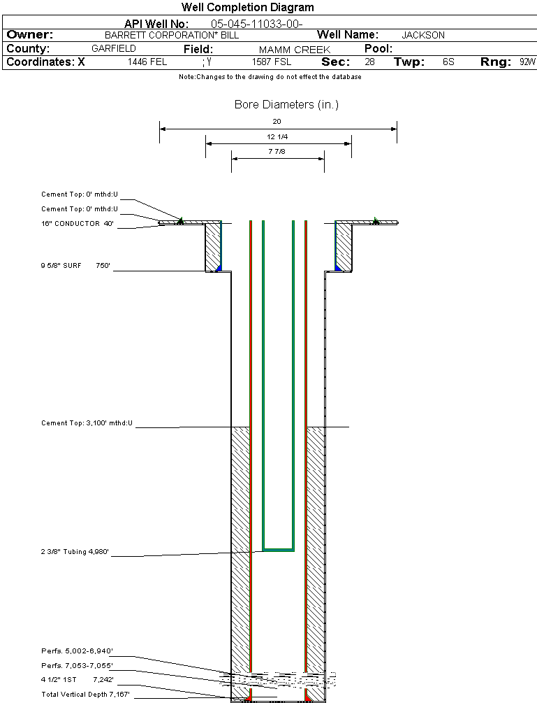 Wellbore #00 Wellbore Classification: GW Status: PR - 3/1/2011 Measured TD: 7250 ft. Vertical TD: 7167 ft.| Wellbore Data for Original Wellbore | Wellbore Classification: GW PR - 3/1/2011 | | Wellbore Permit | DIRECTIONAL | | Permit #: | 20052506 | Expiration Date: | 8/17/2006 | | Proposed Top PZ Location: | Sec:28 Twp: 6S 92W | Footage: 2209 FSL 1981 FEL | | Bottom Hole Location: | Sec:28 Twp: 6S 92W | Footage: 2209 FSL 1981 FEL | | Proposed Depth/Form: | 7216 ft. | | Surface Mineral Owner Same: | Yes | | Mineral Owner: | FEE | Surface Owner: | FEE | | Unit: | | Unit Number: | | | Formation And Spacing: | Code: ILES , Formation: ILES , Order: 191-10 , Unit Acreage: 160, Drill Unit: SE4 | | Formation And Spacing: | Code: WMFK , Formation: WILLIAMS FORK , Order: 191-8 , Unit Acreage: 160, Drill Unit: SE4 |