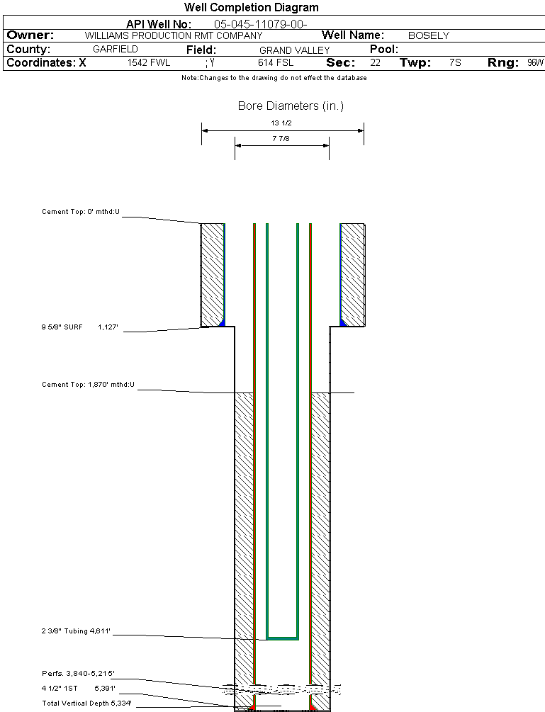 | Wellbore Completed | | Completion Date: | 2/25/2006 | | Spud Date: | 2/19/2006 | Spud Date Is: | ACTUAL | | Measured TD: | 5430 ft. | Measured PB depth: | 5370 ft. | | True Vertical TD: | 5334 ft. | True Vertical PB depth: | | | Top PZ Location: | Sec:22 Twp: 7S 96W | Footage: 1108 FSL 1684 FWL | | Bottom Hole Location: | Sec:22 Twp: 7S 96W | Footage: 1108 FSL 1684 FWL | | Log Types: | CBL; HIGH RES INDUCTION/SPECTRAL DENSITY/DUAL SPACED NEUTRON; MUD | | Casing: | String Type: SURF, Hole Size: 13.5 in., Size: 9.625 in., Top: 0 ft., Depth: 1127 ft., Weight: , Citings Type: ACTUAL | | Cement: | Sacks: 375, Top: 0 ft., Bottom: 1127 ft., Determination Method: CALC | | Casing: | String Type: 1ST, Hole Size: 7.875 in., Size: 4.5 in., Top: 0 ft., Depth: 5391 ft., Weight: , Citings Type: ACTUAL | | Cement: | Sacks: 850, Top: 1870 ft., Bottom: 5391 ft., Determination Method: CBL | | Formation | Interval Top | Log Bottom | Cored | DSTs | | WASATCH G | 865 ft. | | N | N | | FORT UNION | 1237 ft. | | N | N | | MESAVERDE | 2459 ft. | | N | N | | CAMEO | 4786 ft. | | N | N | | ROLLINS | 5262 ft. | | N | N |