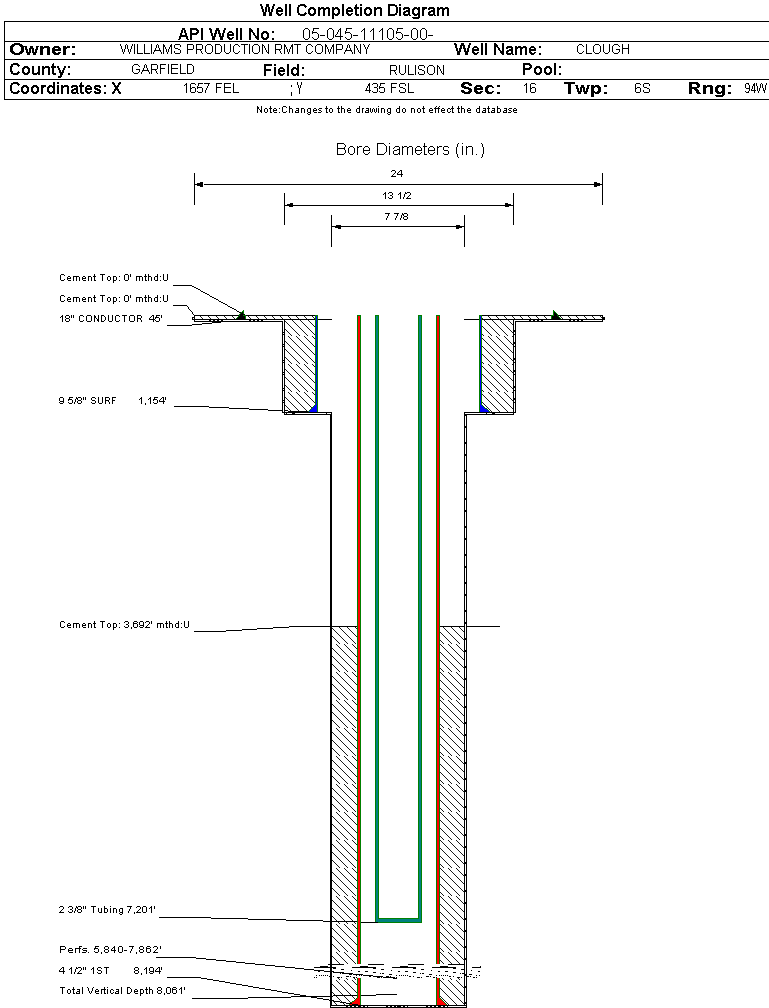 | | Perforation Data: | | Interval Top: | 5840 ft. | # Of Holes: | 115 | | Interval Bottom: | 7862 ft. | Hole Size: | 0.35 in. |