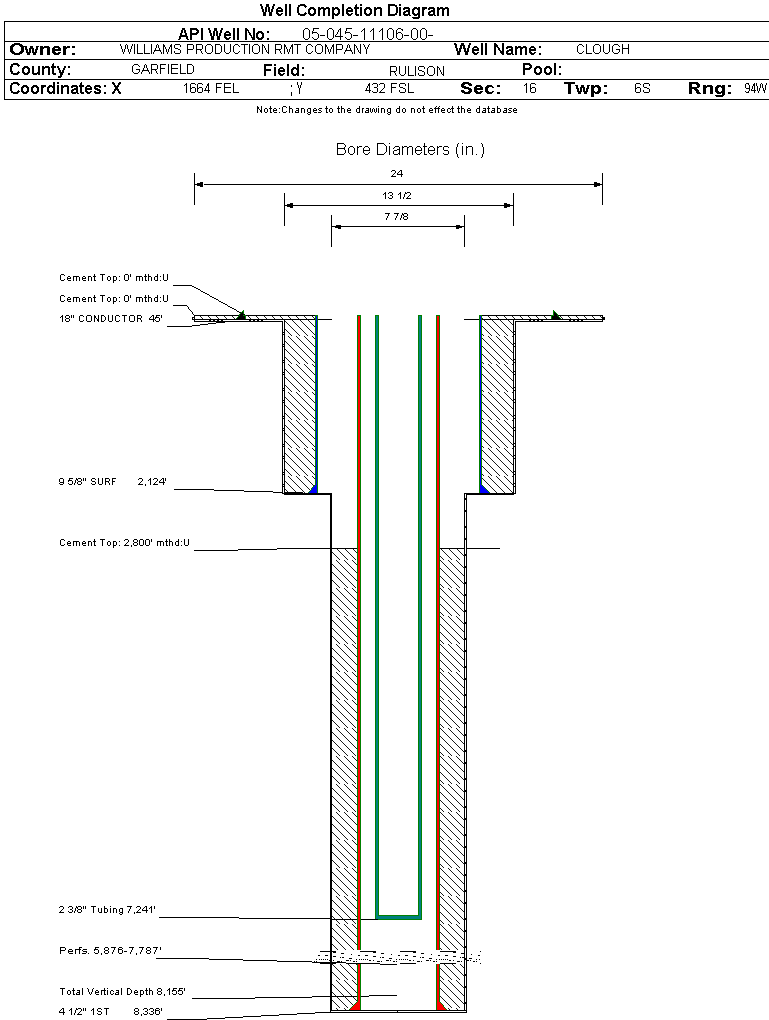 | Wellbore Completed | | Completion Date: | 1/4/2008 | | Spud Date: | 12/23/2007 | Spud Date Is: | ACTUAL | | Measured TD: | 8351 ft. | Measured PB depth: | 8300 ft. | | True Vertical TD: | 8155 ft. | True Vertical PB depth: | 8104 ft. | | Top PZ Location: | Sec:16 Twp: 6S 94W | Footage: 1335 FSL 607 FEL | | Bottom Hole Location: | Sec:16 Twp: 6S 94W | Footage: 1335 FSL 607 FEL | | Log Types: | CBL; RMTE; MUD | | Casing: | String Type: CONDUCTOR, Hole Size: 24 in., Size: 18 in., Top: 0 ft., Depth: 45 ft., Weight: , Citings Type: ACTUAL | | Cement: | Sacks: 25, Top: 0 ft., Bottom: 45 ft., Determination Method: | | Casing: | String Type: SURF, Hole Size: 13.5 in., Size: 9.625 in., Top: 0 ft., Depth: 2124 ft., Weight: , Citings Type: ACTUAL | | Cement: | Sacks: 498, Top: 0 ft., Bottom: 2124 ft., Determination Method: | | Casing: | String Type: 1ST, Hole Size: 7.875 in., Size: 4.5 in., Top: 0 ft., Depth: 8336 ft., Weight: , Citings Type: ACTUAL | | Cement: | Sacks: 1103, Top: 2800 ft., Bottom: 8336 ft., Determination Method: CBL | | Formation | Interval Top | Log Bottom | Cored | DSTs | | WASATCH G | 1794 ft. | | N | N | | MESAVERDE | 4433 ft. | | N | N | | CAMEO | 7262 ft. | | N | N | | ROLLINS | 8251 ft. | | N | N |