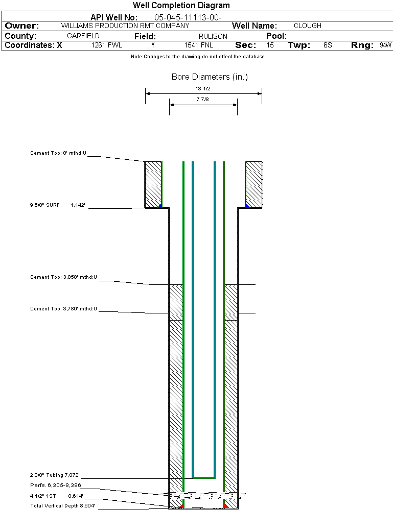 Wellbore #00 Wellbore Classification: CBM Status: PR - 8/8/2006 Measured TD: 8665 ft. Vertical TD: 8604 ft.| Wellbore Data for Original Wellbore | Wellbore Classification: CBM PR - 8/8/2006 | | Wellbore Permit | DIRECTIONAL | | Permit #: | 20064053 | Expiration Date: | 9/24/2007 | | Proposed Top PZ Location: | Sec: Twp: | Footage: 1082 FNL 620 FWL | | Bottom Hole Location: | Sec:15 Twp: 6S 94W | Footage: 1082 FNL 620 FWL | | Proposed Depth/Form: | 8700 ft. | | Surface Mineral Owner Same: | Yes | | Mineral Owner: | FEE | Surface Owner: | FEE | | Unit: | | Unit Number: | | | Formation And Spacing: | Code: WMFK , Formation: WILLIAMS FORK , Order: 510-8 , Unit Acreage: 320, Drill Unit: N2 |
