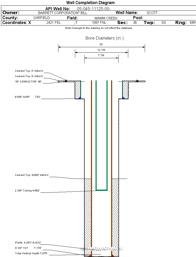 | Wellbore Completed | | Completion Date: | 11/10/2005 | | Spud Date: | 9/23/2005 | Spud Date Is: | ACTUAL | | Measured TD: | 7185 ft. | Measured PB depth: | 7127 ft. | | True Vertical TD: | 7075 ft. | True Vertical PB depth: | 7017 ft. | | Top PZ Location: | Sec:36 Twp: 6S 92W | Footage: 469 FNL 1964 FEL | | Bottom Hole Location: | Sec:36 Twp: 6S 92W | Footage: 469 FNL 1964 FEL | | Log Types: | HALLIBURTON SD/DSN/HRI/MICROLOG & RRECISION CBL | | Casing: | String Type: CONDUCTOR, Hole Size: 20 in., Size: 16 in., Top: , Depth: 40 ft., Weight: , Citings Type: ACTUAL | | Cement: | Sacks: , Top: 0 ft., Bottom: 40 ft., Determination Method: CALC | | Casing: | String Type: SURF, Hole Size: 12.25 in., Size: 9.625 in., Top: 0 ft., Depth: 732 ft., Weight: , Citings Type: ACTUAL | | Cement: | Sacks: 230, Top: 0 ft., Bottom: 740 ft., Determination Method: CALC | | Casing: | String Type: 1ST, Hole Size: 7.875 in., Size: 4.5 in., Top: 0 ft., Depth: 7170 ft., Weight: , Citings Type: ACTUAL | | Cement: | Sacks: 960, Top: 4000 ft., Bottom: 7185 ft., Determination Method: CBL | | Formation | Interval Top | Log Bottom | Cored | DSTs | | WILLIAMS FORK | 3258 ft. | | N | N | | ROLLINS | 6956 ft. | | N | N |