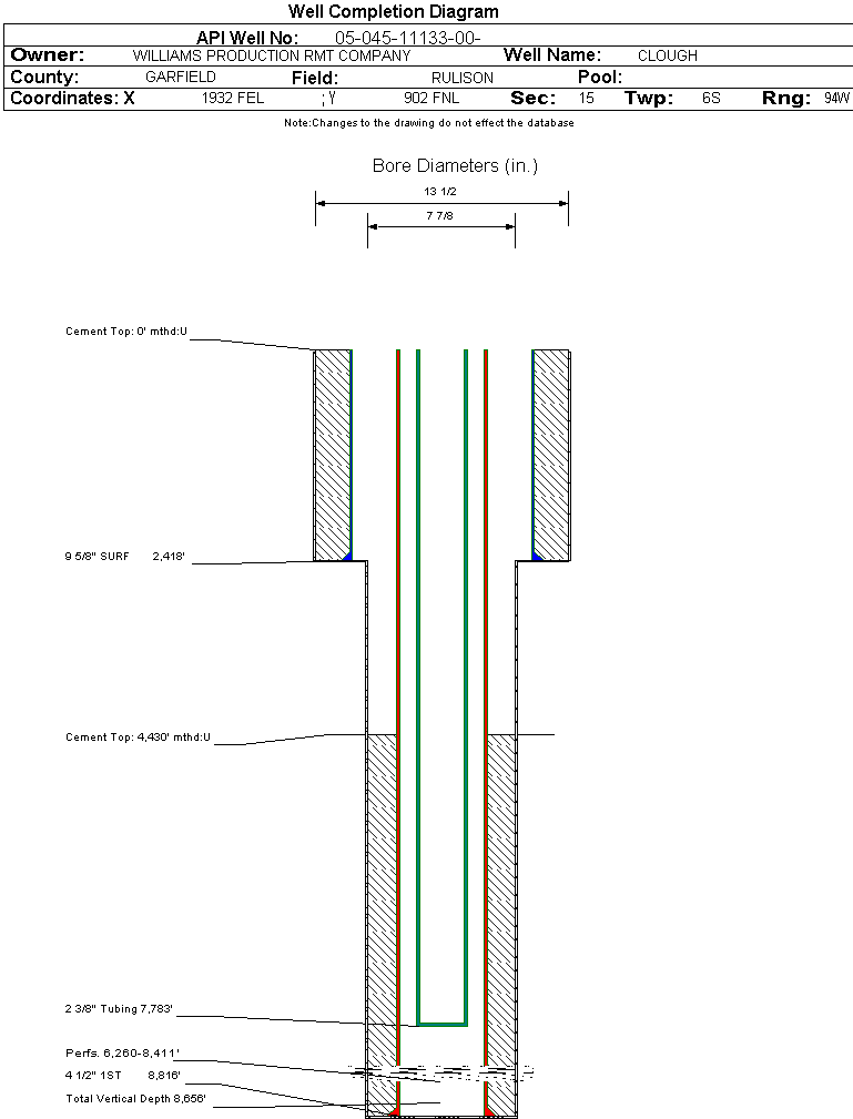 Wellbore #00 Wellbore Classification: GW Status: PR - 5/30/2006 Measured TD: 8837 ft. Vertical TD: 8656 ft.| Wellbore Data for Original Wellbore | Wellbore Classification: GW PR - 5/30/2006 | | Wellbore Permit | DIRECTIONAL | | Permit #: | 20052801 | Expiration Date: | 9/12/2006 | | Proposed Top PZ Location: | Sec:15 Twp: T6S R94W | Footage: 1221 FNL 622 FEL | | Bottom Hole Location: | Sec:15 Twp: T6S R94W | Footage: 1221 FNL 622 FEL | | Proposed Depth/Form: | 8780 ft. | | Surface Mineral Owner Same: | Yes | | Mineral Owner: | FEE | Surface Owner: | FEE | | Unit: | | Unit Number: | | | Formation And Spacing: | Code: WMFK , Formation: WILLIAMS FORK , Order: 139-38 , Unit Acreage: 320, Drill Unit: N/2 |