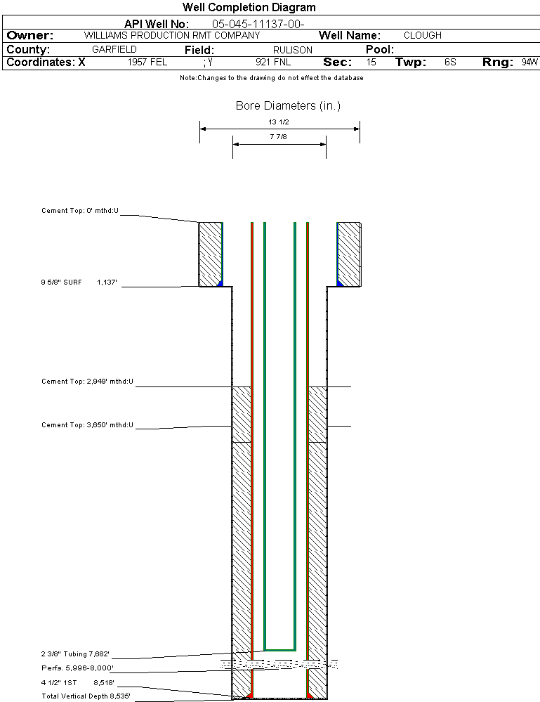 Wellbore #00 Wellbore Classification: GW Status: PR - 8/5/2005 Measured TD: 8540 ft. Vertical TD: 8535 ft.| Wellbore Data for Original Wellbore | Wellbore Classification: GW PR - 8/5/2005 | | Wellbore Permit | DIRECTIONAL | | Permit #: | 20052805 | Expiration Date: | 9/12/2006 | | Proposed Top PZ Location: | Sec: Twp: | Footage: 1029 FNL 2010 FEL | | Bottom Hole Location: | Sec: Twp: | Footage: 1029 FNL 2010 FEL | | Proposed Depth/Form: | 9595 ft. | | Surface Mineral Owner Same: | Yes | | Mineral Owner: | FEE | Surface Owner: | FEE | | Unit: | | Unit Number: | | | Formation And Spacing: | Code: WMFK , Formation: WILLIAMS FORK , Order: 510-8 , Unit Acreage: 320, Drill Unit: N/2 | | Casing: | String Type: CONDUCTOR, Hole Size: 13.5 in., Size: 9.625 in., Top: , Depth: 110 ft., Weight: 32.3 , Citings Type: PLANNED | | Cement: | Sacks: 492, Top: , Bottom: 1100 ft. |