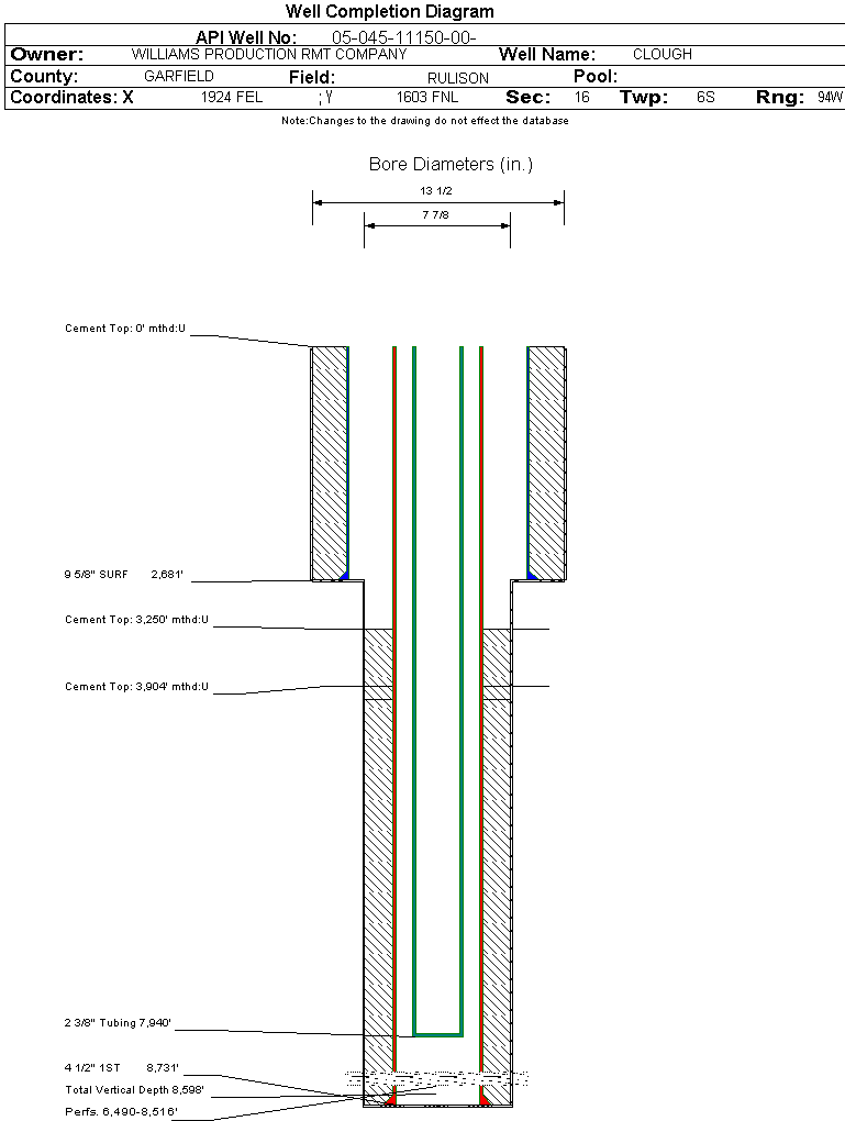Wellbore #00 Wellbore Classification: GW Status: PR - 6/8/2006 Measured TD: 8750 ft. Vertical TD: 8598 ft.| Wellbore Data for Original Wellbore | Wellbore Classification: GW PR - 6/8/2006 | | Wellbore Permit | DIRECTIONAL | | Permit #: | 20062850 | Expiration Date: | 8/15/2007 | | Proposed Top PZ Location: | Sec: Twp: | Footage: 1225 FNL 679 FEL | | Bottom Hole Location: | Sec:16 Twp: 6S 94W | Footage: 1225 FNL 679 FEL | | Proposed Depth/Form: | 8769 ft. | | Surface Mineral Owner Same: | No | | Mineral Owner: | FEDERAL | Surface Owner: | FEE | | Unit: | | Unit Number: | | | Formation And Spacing: | Code: WMFK , Formation: WILLIAMS FORK , Order: 510-12 , Unit Acreage: 320, Drill Unit: E2 |