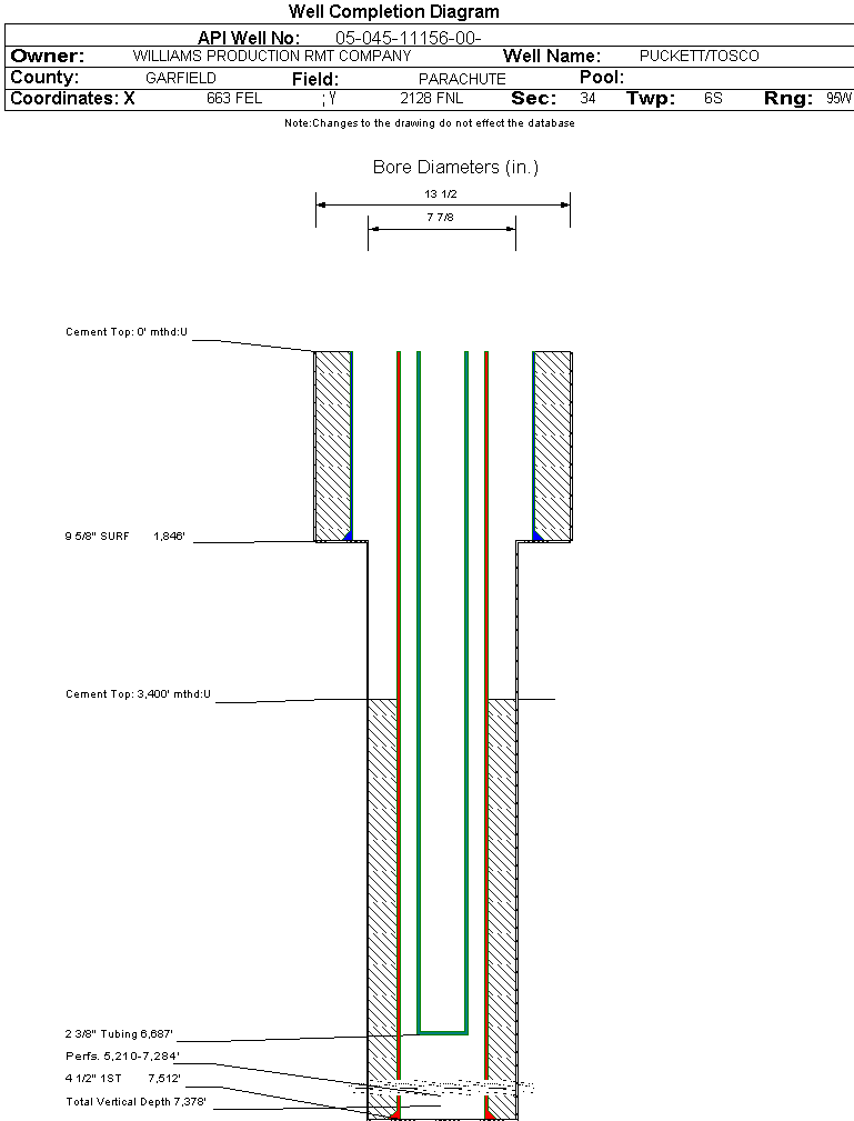 | Wellbore Completed | | Completion Date: | 5/24/2006 | | Spud Date: | 5/10/2006 | Spud Date Is: | ACTUAL | | Measured TD: | 7538 ft. | Measured PB depth: | 7410 ft. | | True Vertical TD: | 7378 ft. | True Vertical PB depth: | | | Top PZ Location: | Sec:34 Twp: 6S 95W | Footage: 1905 FNL 1071 FEL | | Bottom Hole Location: | Sec:34 Twp: 6S 95W | Footage: 1905 FNL 1071 FEL | | Log Types: | CBL; RESERVOIR MONITOR TOOL ELITE | | Casing: | String Type: SURF, Hole Size: 13.5 in., Size: 9.625 in., Top: 0 ft., Depth: 1846 ft., Weight: , Citings Type: ACTUAL | | Cement: | Sacks: 430, Top: 0 ft., Bottom: 1846 ft., Determination Method: CALC | | Casing: | String Type: 1ST, Hole Size: 7.875 in., Size: 4.5 in., Top: 0 ft., Depth: 7512 ft., Weight: , Citings Type: ACTUAL | | Cement: | Sacks: 1060, Top: 3400 ft., Bottom: 7512 ft., Determination Method: CBL | | Formation | Interval Top | Log Bottom | Cored | DSTs | | WASATCH G | 1647 ft. | | N | N | | FORT UNION | 1914 ft. | | N | N | | MESAVERDE | 3959 ft. | | N | N | | CAMEO | 6652 ft. | | N | N | | ROLLINS | 7357 ft. | | N | N |