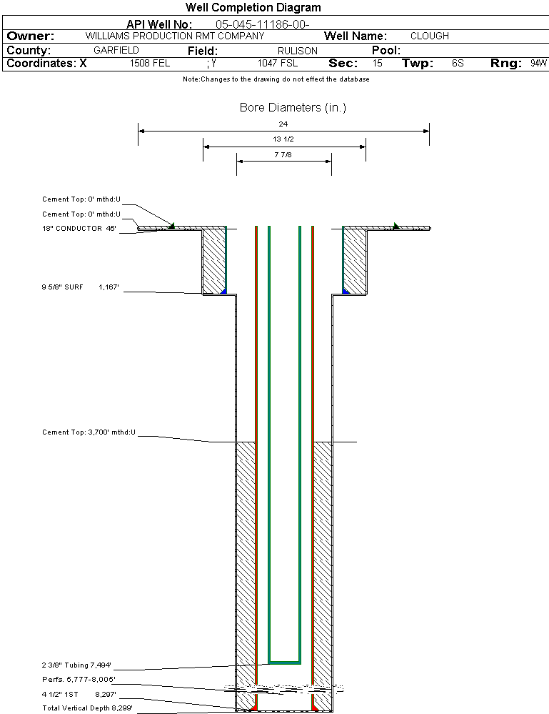 | Wellbore Completed | | Completion Date: | 6/4/2007 | | Spud Date: | 5/22/2007 | Spud Date Is: | ACTUAL | | Measured TD: | 8330 ft. | Measured PB depth: | 8200 ft. | | True Vertical TD: | 8299 ft. | True Vertical PB depth: | | | Top PZ Location: | Sec:15 Twp: 6S 94W | Footage: 763 FSL 2002 FEL | | Bottom Hole Location: | Sec:15 Twp: 6S 94W | Footage: 763 FSL 2002 FEL | | Log Types: | CBL; RMTE; MUD | | Casing: | String Type: CONDUCTOR, Hole Size: 24 in., Size: 18 in., Top: , Depth: 45 ft., Weight: 48 , Citings Type: ACTUAL | | Cement: | Sacks: 25, Top: 0 ft., Bottom: 45 ft., Determination Method: | | Casing: | String Type: SURF, Hole Size: 13.5 in., Size: 9.625 in., Top: 0 ft., Depth: 1167 ft., Weight: , Citings Type: ACTUAL | | Cement: | Sacks: 310, Top: 0 ft., Bottom: 1167 ft., Determination Method: | | Casing: | String Type: 1ST, Hole Size: 7.875 in., Size: 4.5 in., Top: 0 ft., Depth: 8297 ft., Weight: , Citings Type: ACTUAL | | Cement: | Sacks: 1040, Top: 3700 ft., Bottom: 8297 ft., Determination Method: CBL | | Formation | Interval Top | Log Bottom | Cored | DSTs | | WASATCH G | 1909 ft. | | N | N | | MESAVERDE | 4478 ft. | | N | N | | CAMEO | 7284 ft. | | N | N | | ROLLINS | 8218 ft. | | N | N |