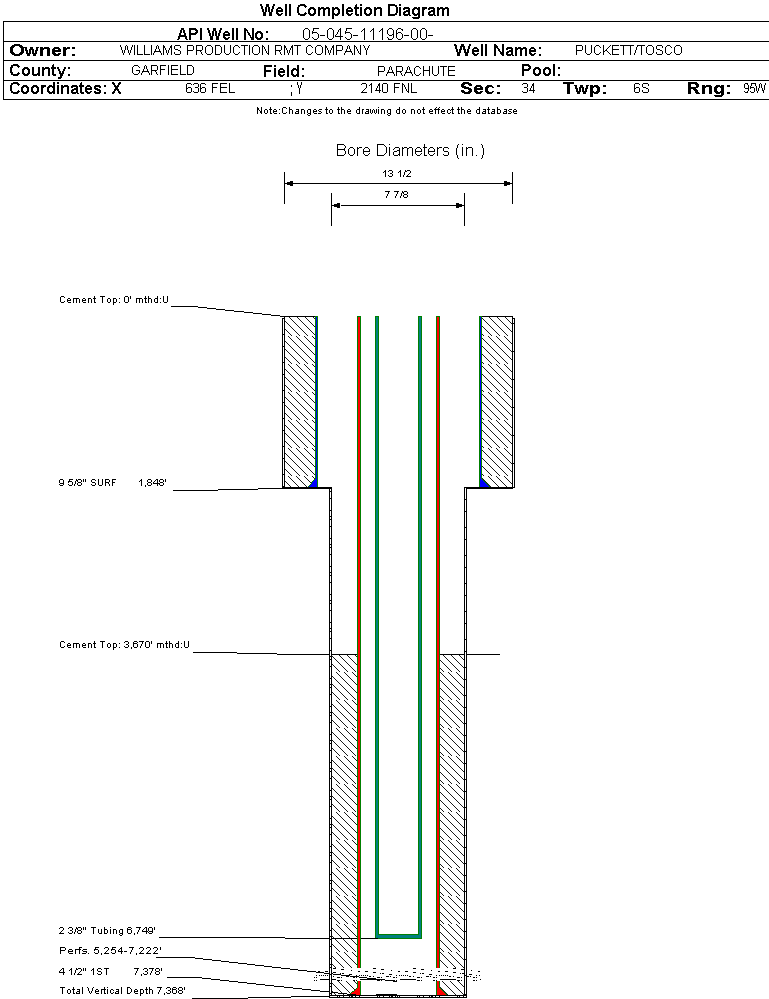 Wellbore #00 Wellbore Classification: GW Status: PR - 8/10/2005 Measured TD: 7393 ft. Vertical TD: 7368 ft.| Wellbore Data for Original Wellbore | Wellbore Classification: GW PR - 8/10/2005 | | Wellbore Permit | DIRECTIONAL | | Permit #: | 20052946 | Expiration Date: | 9/18/2006 | | Proposed Top PZ Location: | Sec: Twp: | Footage: 1906 FNL 203 FEL | | Bottom Hole Location: | Sec: Twp: | Footage: 1906 FNL 203 FEL | | Proposed Depth/Form: | 7454 ft. | | Surface Mineral Owner Same: | Yes | | Mineral Owner: | FEE | Surface Owner: | FEE | | Unit: | | Unit Number: | | | Formation And Spacing: | Code: WMFK , Formation: WILLIAMS FORK , Order: 139-38 , Unit Acreage: 320, Drill Unit: N2 | | Casing: | String Type: CONDUCTOR, Hole Size: 24 in., Size: 18 in., Top: , Depth: 45 ft., Weight: 32 , Citings Type: PLANNED | | Cement: | Sacks: 25, Top: 0 ft., Bottom: 45 ft. |