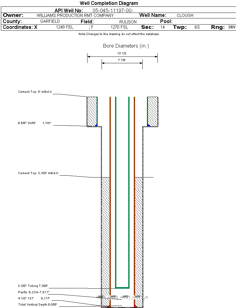 Wellbore #00 Wellbore Classification: GW Status: PR - 6/8/2006 Measured TD: 8125 ft. Vertical TD: 8056 ft.| Wellbore Data for Original Wellbore | Wellbore Classification: GW PR - 6/8/2006 | | Wellbore Permit | DIRECTIONAL | | Permit #: | 20062875 | Expiration Date: | 8/10/2007 | | Proposed Top PZ Location: | Sec: Twp: | Footage: 626 FSL 731 FEL | | Bottom Hole Location: | Sec: Twp: | Footage: 626 FSL 731 FEL | | Proposed Depth/Form: | 8116 ft. | | Surface Mineral Owner Same: | Yes | | Mineral Owner: | FEE | Surface Owner: | FEE | | Unit: | | Unit Number: | | | Formation And Spacing: | Code: WMFK , Formation: WILLIAMS FORK , Order: 139-38 , Unit Acreage: 320, Drill Unit: E2 |
