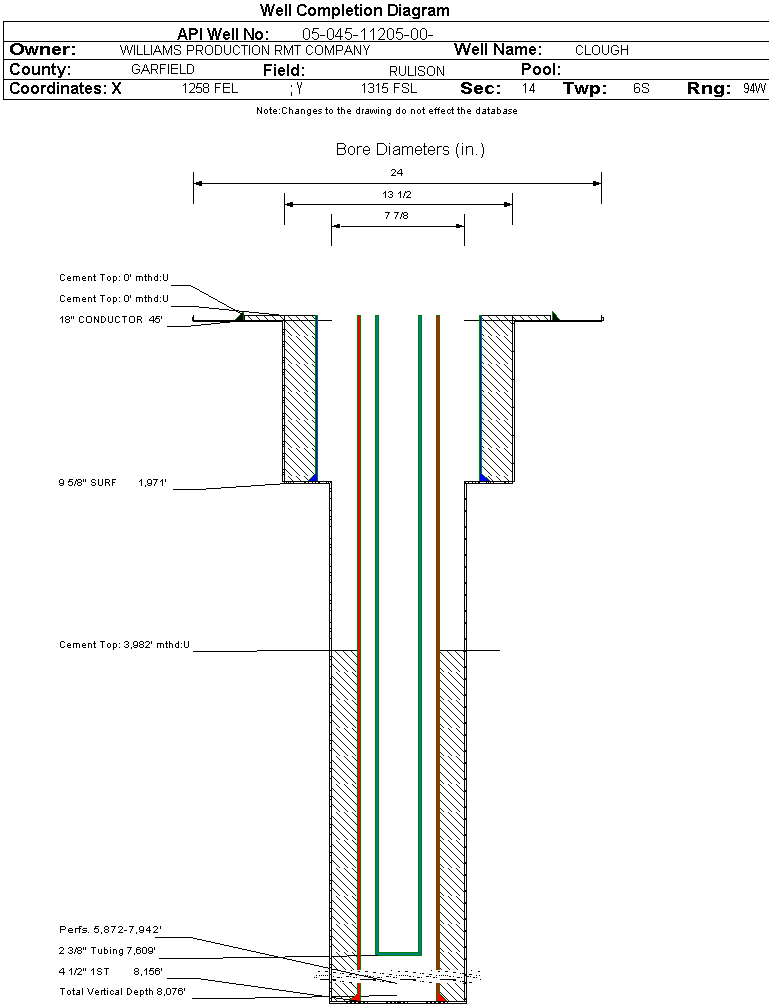 | Wellbore Completed | | Completion Date: | 3/11/2007 | | Spud Date: | 2/27/2007 | Spud Date Is: | ACTUAL | | Measured TD: | 8180 ft. | Measured PB depth: | 8124 ft. | | True Vertical TD: | 8076 ft. | True Vertical PB depth: | | | Top PZ Location: | Sec:14 Twp: 6S 94W | Footage: 2038 FSL 1978 FEL | | Bottom Hole Location: | Sec:14 Twp: 6S 94W | Footage: 2038 FSL 1978 FEL | | Log Types: | CBL; RESERVOIR MONITOR TOOL ELITE, MUD | | Casing: | String Type: CONDUCTOR, Hole Size: 24 in., Size: 18 in., Top: 48 ft., Depth: 45 ft., Weight: , Citings Type: ACTUAL | | Cement: | Sacks: 25, Top: 0 ft., Bottom: 45 ft., Determination Method: | | Casing: | String Type: SURF, Hole Size: 13.5 in., Size: 9.625 in., Top: 0 ft., Depth: 1971 ft., Weight: , Citings Type: ACTUAL | | Cement: | Sacks: 440, Top: 0 ft., Bottom: 1971 ft., Determination Method: | | Casing: | String Type: 1ST, Hole Size: 7.875 in., Size: 4.5 in., Top: 0 ft., Depth: 8156 ft., Weight: , Citings Type: ACTUAL | | Cement: | Sacks: 1167, Top: 3982 ft., Bottom: 8156 ft., Determination Method: CBL | | Formation | Interval Top | Log Bottom | Cored | DSTs | | WASATCH G | 1703 ft. | | N | N | | WILLIAMS FORK | 4262 ft. | | N | N | | CAMEO | 7263 ft. | | N | N |