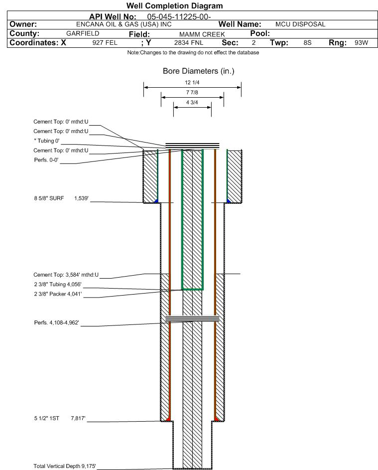 Wellbore #00 Wellbore Classification: DSPW Status: PA - 6/15/2012 Measured TD: 9185 ft. Vertical TD: 9175 ft.| Wellbore Data for Original Wellbore | Wellbore Classification: DSPW PA - 6/15/2012 | | Wellbore Permit | DIRECTIONAL | | Permit #: | 20075507 | Expiration Date: | 10/2/2008 | | Proposed Top PZ Location: | Sec: Twp: | Footage: 2614 FNL 756 FEL | | Bottom Hole Location: | Sec:2 Twp: 8S 93W | Footage: 2614 FNL 756 FEL | | Proposed Depth/Form: | 9185 ft. | | Surface Mineral Owner Same: | Yes | | Mineral Owner: | FEDERAL | Surface Owner: | FEDERAL | | Unit: | MIDDLETON CREEK | Unit Number: | COC 68997X | | Formation And Spacing: | Code: ILES , Formation: ILES , Order: , Unit Acreage: , Drill Unit: | | Formation And Spacing: | Code: WMFK , Formation: WILLIAMS FORK , Order: , Unit Acreage: , Drill Unit: | | Casing: | String Type: CONDUCTOR, Hole Size: 24 in., Size: 16 in., Top: , Depth: 40 ft., Weight: , Citings Type: PLANNED | | Cement: | Sacks: 4, Top: 0 ft., Bottom: 40 ft. | | Casing: | String Type: SURF, Hole Size: 12.25 in., Size: 8.625 in., Top: , Depth: 1539 ft., Weight: 24 , Citings Type: PLANNED | | Cement: | Sacks: 1015, Top: 0 ft., Bottom: 1539 ft. | | Casing: | String Type: 1ST, Hole Size: 7.875 in., Size: 5.5 in., Top: , Depth: 7865 ft., Weight: 17 , Citings Type: PLANNED | | Cement: | Sacks: 550, Top: 3584 ft., Bottom: 7865 ft. | | Casing: | String Type: 2ND, Hole Size: 7.875 in., Size: 3.5 in., Top: , Depth: 9185 ft., Weight: 9.3 , Citings Type: PLANNED | | Cement: | Sacks: 100, Top: 7300 ft., Bottom: 9185 ft. |