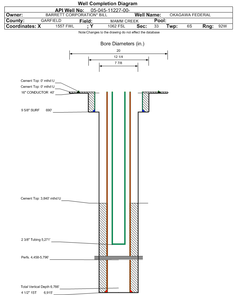 | Wellbore Completed | | Completion Date: | 7/29/2006 | | Spud Date: | 6/17/2006 | Spud Date Is: | ACTUAL | | Measured TD: | 6930 ft. | Measured PB depth: | 6872 ft. | | True Vertical TD: | 6766 ft. | True Vertical PB depth: | 6708 ft. | | Top PZ Location: | Sec:33 Twp: 6S 92W | Footage: 205 FSL 1979 FWL | | Bottom Hole Location: | Sec:33 Twp: 6S 92W | Footage: 205 FSL 1979 FWL | | Log Types: | HALLIBURTON HRI/SD/DSN/;SCHLUMBERGER CBL/GR/CCL | | Casing: | String Type: CONDUCTOR, Hole Size: 20 in., Size: 16 in., Top: , Depth: 40 ft., Weight: , Citings Type: ACTUAL | | Cement: | Sacks: , Top: 0 ft., Bottom: 40 ft., Determination Method: | | Casing: | String Type: SURF, Hole Size: 12.25 in., Size: 9.625 in., Top: 0 ft., Depth: 690 ft., Weight: , Citings Type: ACTUAL | | Cement: | Sacks: 230, Top: 0 ft., Bottom: 690 ft., Determination Method: | | Casing: | String Type: 1ST, Hole Size: 7.875 in., Size: 4.5 in., Top: 0 ft., Depth: 6915 ft., Weight: , Citings Type: ACTUAL | | Cement: | Sacks: 1000, Top: 3840 ft., Bottom: 6930 ft., Determination Method: CBL | | Formation | Interval Top | Log Bottom | Cored | DSTs | | WILLIAMS FORK | 2658 ft. | | N | N | | ROLLINS | 6588 ft. | | N | N |