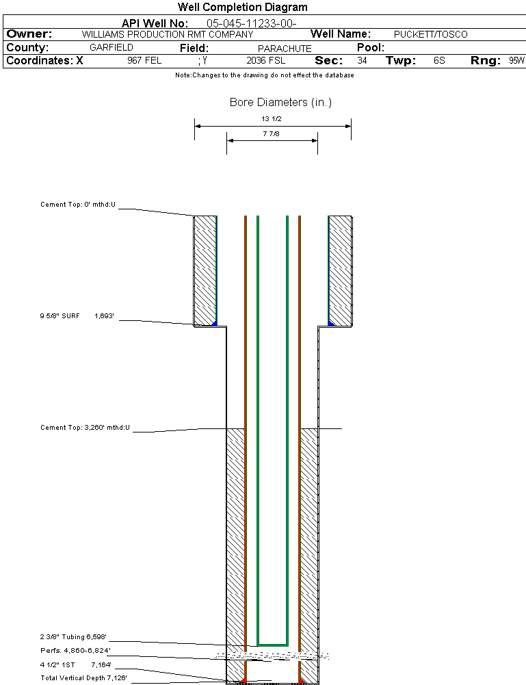 | Wellbore Completed | | Completion Date: | 2/14/2006 | | Spud Date: | 2/2/2006 | Spud Date Is: | ACTUAL | | Measured TD: | 7180 ft. | Measured PB depth: | 7108 ft. | | True Vertical TD: | 7126 ft. | True Vertical PB depth: | | | Top PZ Location: | Sec:34 Twp: 6S 95W | Footage: 1711 FSL 374 FEL | | Bottom Hole Location: | Sec:34 Twp: 6S 95W | Footage: 1711 FSL 374 FEL | | Log Types: | CBL; HIGH RESOLUTION INDUCTION, SPECTRAL DENSITY, DUAL SPACED NEUTRON | | Casing: | String Type: SURF, Hole Size: 13.5 in., Size: 9.625 in., Top: 0 ft., Depth: 1693 ft., Weight: , Citings Type: ACTUAL | | Cement: | Sacks: 458, Top: 0 ft., Bottom: 1693 ft., Determination Method: CALC | | Casing: | String Type: 1ST, Hole Size: 7.875 in., Size: 4.5 in., Top: 0 ft., Depth: 7164 ft., Weight: , Citings Type: ACTUAL | | Cement: | Sacks: 864, Top: 3260 ft., Bottom: 7164 ft., Determination Method: CBL | | Formation | Interval Top | Log Bottom | Cored | DSTs | | WASATCH G | 1475 ft. | | N | N | | FORT UNION | 1792 ft. | | N | N | | MESAVERDE | 3730 ft. | | N | N | | CAMEO | 6423 ft. | | N | N | | ROLLINS | 7084 ft. | | N | N |