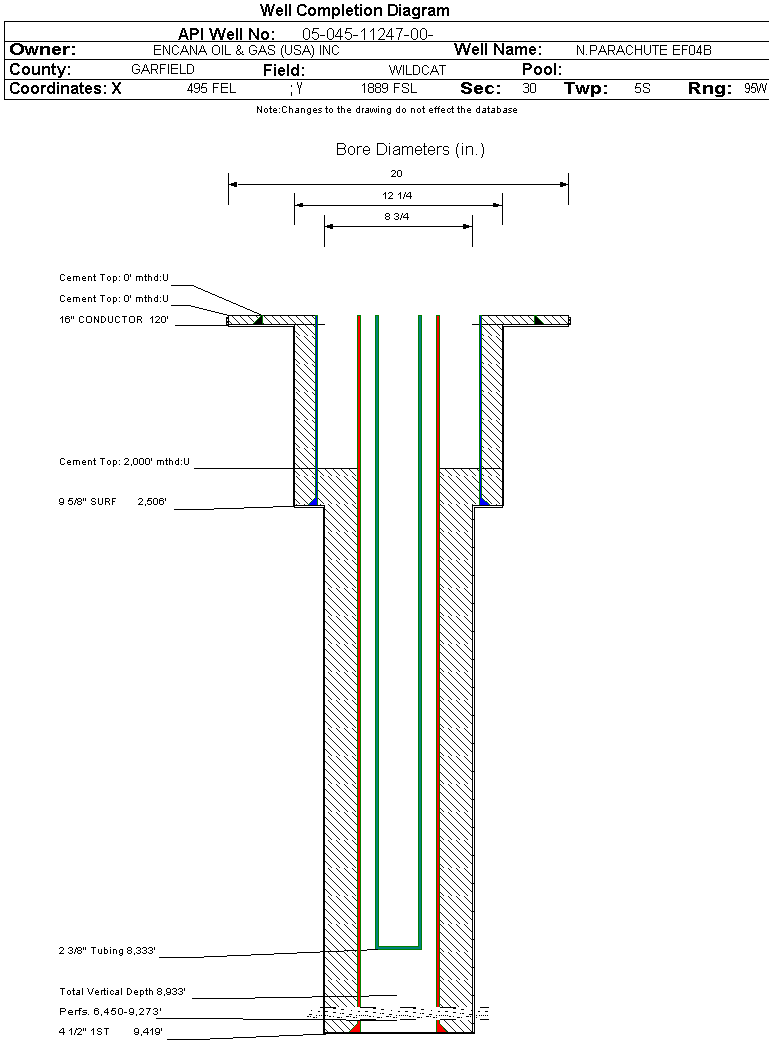 | Wellbore Completed | | Completion Date: | 3/17/2006 | | Spud Date: | 2/20/2006 | Spud Date Is: | ACTUAL | | Measured TD: | 9433 ft. | Measured PB depth: | 9416 ft. | | True Vertical TD: | 8933 ft. | True Vertical PB depth: | | | Top PZ Location: | Sec:32 Twp: 5S 95W | Footage: 270 FNL 423 FWL | | Bottom Hole Location: | Sec:32 Twp: 5S 95W | Footage: 270 FNL 423 FWL | | Log Types: | CBL, MUD | | Casing: | String Type: CONDUCTOR, Hole Size: 20 in., Size: 16 in., Top: 0 ft., Depth: 120 ft., Weight: , Citings Type: ACTUAL | | Cement: | Sacks: 210, Top: 0 ft., Bottom: 120 ft., Determination Method: CALC | | Casing: | String Type: SURF, Hole Size: 12.25 in., Size: 9.625 in., Top: 0 ft., Depth: 2506 ft., Weight: , Citings Type: ACTUAL | | Cement: | Sacks: 810, Top: 0 ft., Bottom: 2520 ft., Determination Method: CALC | | Casing: | String Type: 1ST, Hole Size: 8.75 in., Size: 4.5 in., Top: 0 ft., Depth: 9419 ft., Weight: , Citings Type: ACTUAL | | Cement: | Sacks: 1250, Top: 2000 ft., Bottom: 9433 ft., Determination Method: CBL | | Formation | Interval Top | Log Bottom | Cored | DSTs | | WILLIAMS FORK | 6088 ft. | 9433 ft. | N | N |