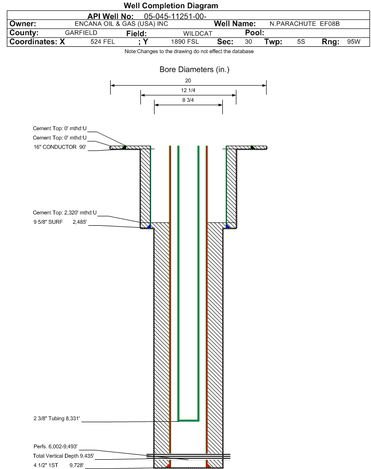 | Wellbore Completed | | Completion Date: | 11/19/2006 | | Spud Date: | 3/26/2006 | Spud Date Is: | ACTUAL | | Measured TD: | 9740 ft. | Measured PB depth: | 9560 ft. | | True Vertical TD: | 9435 ft. | True Vertical PB depth: | 9255 ft. | | Top PZ Location: | Sec:30 Twp: 5S 96W | Footage: 1776 FNL 1050 FEL | | Bottom Hole Location: | Sec:30 Twp: 5S 96W | Footage: 1776 FNL 1050 FEL | | Log Types: | CBL AND MUD. | | Casing: | String Type: CONDUCTOR, Hole Size: 20 in., Size: 16 in., Top: 0 ft., Depth: 90 ft., Weight: , Citings Type: ACTUAL | | Cement: | Sacks: , Top: 0 ft., Bottom: 90 ft., Determination Method: CALC | | Casing: | String Type: SURF, Hole Size: 12.25 in., Size: 9.625 in., Top: 0 ft., Depth: 2485 ft., Weight: , Citings Type: ACTUAL | | Cement: | Sacks: 695, Top: 0 ft., Bottom: 2485 ft., Determination Method: CALC | | Casing: | String Type: 1ST, Hole Size: 8.75 in., Size: 4.5 in., Top: 0 ft., Depth: 9728 ft., Weight: , Citings Type: ACTUAL | | Cement: | Sacks: 1475, Top: 2320 ft., Bottom: 9740 ft., Determination Method: CBL | | Formation | Interval Top | Log Bottom | Cored | DSTs | | WILLIAMS FORK | 5930 ft. | 9526 ft. | N | N | | ROLLINS | 9526 ft. | 9740 ft. | N | N |