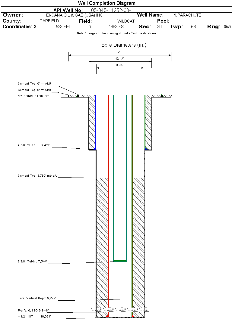 | Wellbore Completed | | Completion Date: | 12/4/2006 | | Spud Date: | 4/9/2006 | Spud Date Is: | ACTUAL | | Measured TD: | 10110 ft. | Measured PB depth: | 10044 ft. | | True Vertical TD: | 9272 ft. | True Vertical PB depth: | 9206 ft. | | Top PZ Location: | Sec:31 Twp: 5S 95W | Footage: 922 FNL 291 FEL | | Bottom Hole Location: | Sec:31 Twp: 5S 95W | Footage: 922 FNL 291 FEL | | Log Types: | CBL(-2 RUNS) AND MUD. | | Casing: | String Type: CONDUCTOR, Hole Size: 20 in., Size: 16 in., Top: 0 ft., Depth: 80 ft., Weight: , Citings Type: ACTUAL | | Cement: | Sacks: , Top: 0 ft., Bottom: 80 ft., Determination Method: CALC | | Casing: | String Type: SURF, Hole Size: 12.25 in., Size: 9.625 in., Top: 0 ft., Depth: 2477 ft., Weight: 36 , Citings Type: ACTUAL | | Cement: | Sacks: 695, Top: 0 ft., Bottom: 2477 ft., Determination Method: CALC | | Casing: | String Type: 1ST, Hole Size: 8.875 in., Size: 4.5 in., Top: 0 ft., Depth: 10091 ft., Weight: 11.6 , Citings Type: ACTUAL | | Cement: | Sacks: 1400, Top: 3780 ft., Bottom: 10110 ft., Determination Method: CBL | | Formation | Interval Top | Log Bottom | Cored | DSTs | | WILLIAMS FORK | 6308 ft. | 9883 ft. | N | N | | ROLLINS | 9883 ft. | 10110 ft. | N | N |