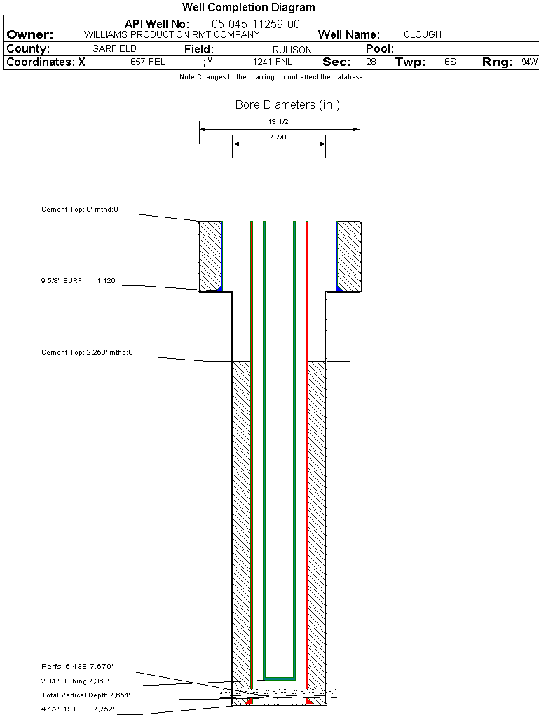 | Wellbore Completed | | Completion Date: | 1/23/2006 | | Spud Date: | 1/8/2006 | Spud Date Is: | ACTUAL | | Measured TD: | 7773 ft. | Measured PB depth: | 7733 ft. | | True Vertical TD: | 7651 ft. | True Vertical PB depth: | | | Top PZ Location: | Sec:28 Twp: 6S 94W | Footage: 236 FNL 741 FEL | | Bottom Hole Location: | Sec:28 Twp: 6S 94W | Footage: 236 FNL 741 FEL | | Log Types: | CBL; RESERVOIR MONITOR TOOL ELITE; MUD | | Casing: | String Type: SURF, Hole Size: 13.5 in., Size: 9.625 in., Top: 0 ft., Depth: 1126 ft., Weight: , Citings Type: ACTUAL | | Cement: | Sacks: 375, Top: 0 ft., Bottom: 1126 ft., Determination Method: CALC | | Casing: | String Type: 1ST, Hole Size: 7.875 in., Size: 4.5 in., Top: 0 ft., Depth: 7752 ft., Weight: , Citings Type: ACTUAL | | Cement: | Sacks: 1140, Top: 2250 ft., Bottom: 7752 ft., Determination Method: CBL | | Formation | Interval Top | Log Bottom | Cored | DSTs | | WASATCH G | 1502 ft. | | N | N | | MESAVERDE | 4059 ft. | | N | N | | CAMEO | 6834 ft. | | N | N | | ROLLINS | 7797 ft. | | N | N |