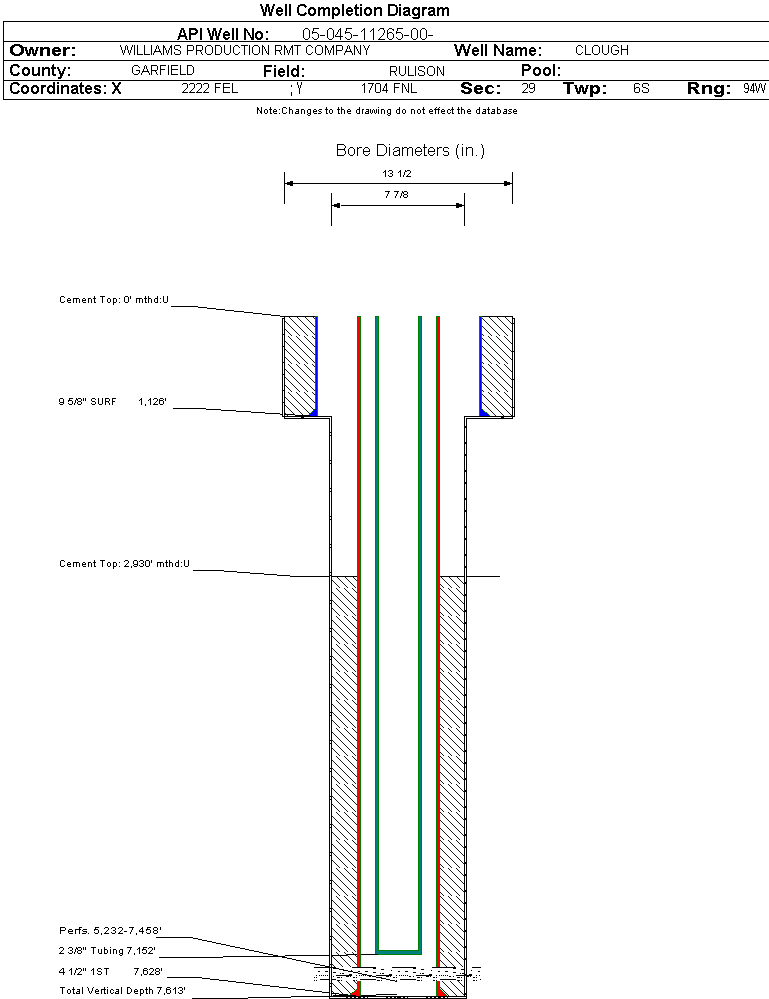 Wellbore #00 Wellbore Classification: GW Status: PR - 5/8/2006 Measured TD: 7642 ft. Vertical TD: 7613 ft.| Wellbore Data for Original Wellbore | Wellbore Classification: GW PR - 5/8/2006 | | Wellbore Permit | DIRECTIONAL | | Permit #: | 20053157 | Expiration Date: | 10/5/2006 | | Proposed Top PZ Location: | Sec: Twp: | Footage: 2172 FNL 1985 FEL | | Bottom Hole Location: | Sec: Twp: | Footage: 2172 FNL 1985 FEL | | Proposed Depth/Form: | 7661 ft. | | Surface Mineral Owner Same: | Yes | | Mineral Owner: | FEE | Surface Owner: | FEE | | Unit: | | Unit Number: | | | Formation And Spacing: | Code: WMFK , Formation: WILLIAMS FORK , Order: 479-7 , Unit Acreage: 320, Drill Unit: N2 |