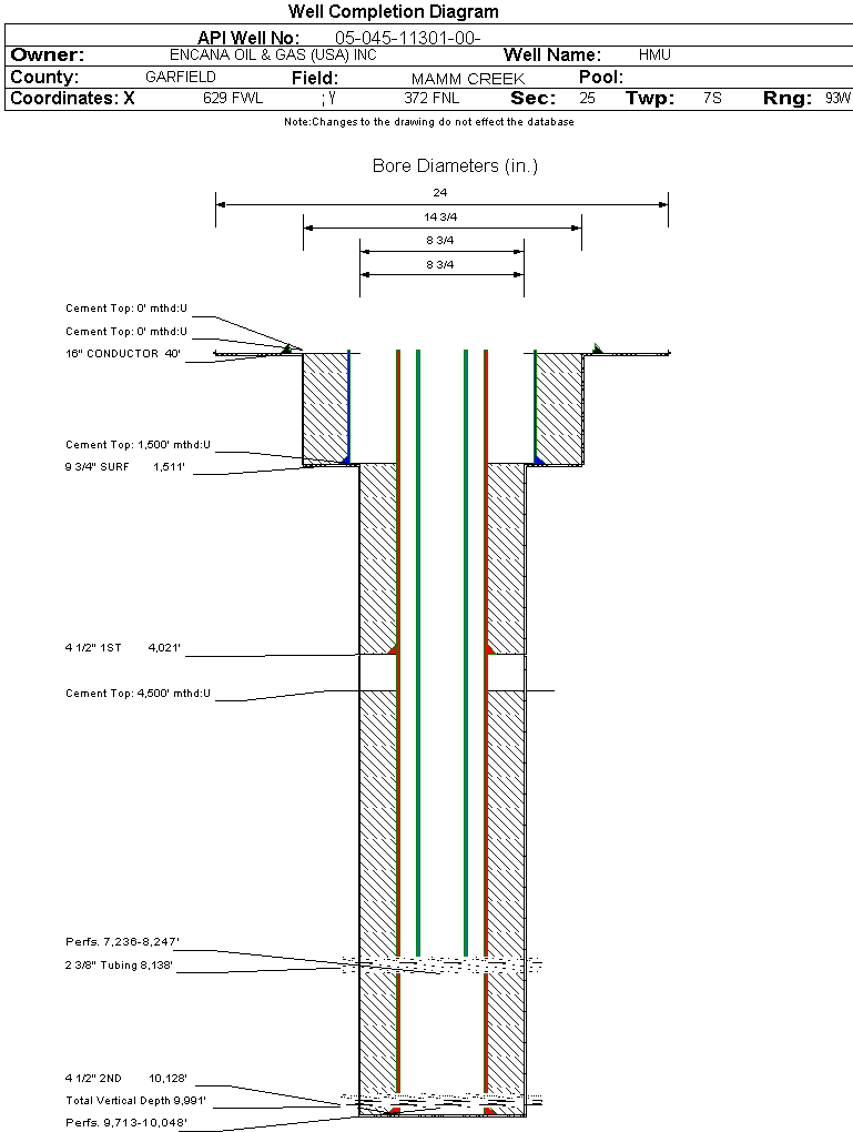 | Wellbore Completed | | Completion Date: | 9/17/2006 | | Spud Date: | 7/24/2006 | Spud Date Is: | ACTUAL | | Measured TD: | 10128 ft. | Measured PB depth: | 10083 ft. | | True Vertical TD: | 9991 ft. | True Vertical PB depth: | | | Top PZ Location: | Sec:26 Twp: 7S 93W | Footage: 645 FNL 651 FEL | | Bottom Hole Location: | Sec:26 Twp: 7S 93W | Footage: 645 FNL 651 FEL | | Log Types: | CBL/TEMP/GR/CCL, PE-AI/GR/SP | | Casing: | String Type: CONDUCTOR, Hole Size: 24 in., Size: 16 in., Top: 0 ft., Depth: 40 ft., Weight: , Citings Type: ACTUAL | | Cement: | Sacks: , Top: 0 ft., Bottom: 40 ft., Determination Method: CALC | | Casing: | String Type: SURF, Hole Size: 12.25 in., Size: 9.833333 in., Top: 0 ft., Depth: 1511 ft., Weight: , Citings Type: ACTUAL | | Cement: | Sacks: 810, Top: 0 ft., Bottom: 1511 ft., Determination Method: CALC | | Casing: | String Type: 1ST, Hole Size: 8.75 in., Size: 4.5 in., Top: 0 ft., Depth: 4021 ft., Weight: , Citings Type: ACTUAL | | Cement: | Sacks: 480, Top: 1500 ft., Bottom: 4021 ft., Determination Method: CBL | | Casing: | String Type: 2ND, Hole Size: 8.75 in., Size: 4.5 in., Top: 0 ft., Depth: 10128 ft., Weight: , Citings Type: ACTUAL | | Cement: | Sacks: 1400, Top: 4500 ft., Bottom: 10128 ft., Determination Method: CBL | | Formation | Interval Top | Log Bottom | Cored | DSTs | | WASATCH | 0 ft. | 5499 ft. | N | N | | MESAVERDE | 5499 ft. | 6035 ft. | N | N | | WILLIAMS FORK | 6036 ft. | 8957 ft. | N | N | | ROLLINS | 8958 ft. | 9495 ft. | N | N | | COZZETTE | 9496 ft. | 9704 ft. | N | N | | CORCORAN | 9705 ft. | | N | N |