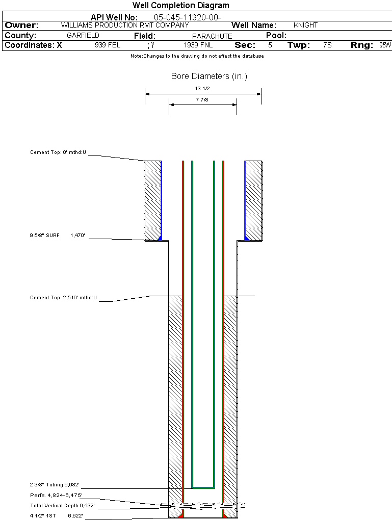 Wellbore #00 Wellbore Classification: GW Status: PR - 9/5/2006 Measured TD: 6628 ft. Vertical TD: 6432 ft.| Wellbore Data for Original Wellbore | Wellbore Classification: GW PR - 9/5/2006 | | Wellbore Permit | DIRECTIONAL | | Permit #: | 20053308 | Expiration Date: | 10/16/2006 | | Proposed Top PZ Location: | Sec:5 Twp: 7S 96W | Footage: 1377 FNL 1908 FEL | | Bottom Hole Location: | Sec:5 Twp: 7S 95W | Footage: 1377 FNL 1908 FEL | | Proposed Depth/Form: | 6624 ft. | | Surface Mineral Owner Same: | Yes | | Mineral Owner: | FEE | Surface Owner: | FEE | | Unit: | | Unit Number: | | | Formation And Spacing: | Code: WMFK , Formation: WILLIAMS FORK , Order: 440-28 , Unit Acreage: 320, Drill Unit: N2 |