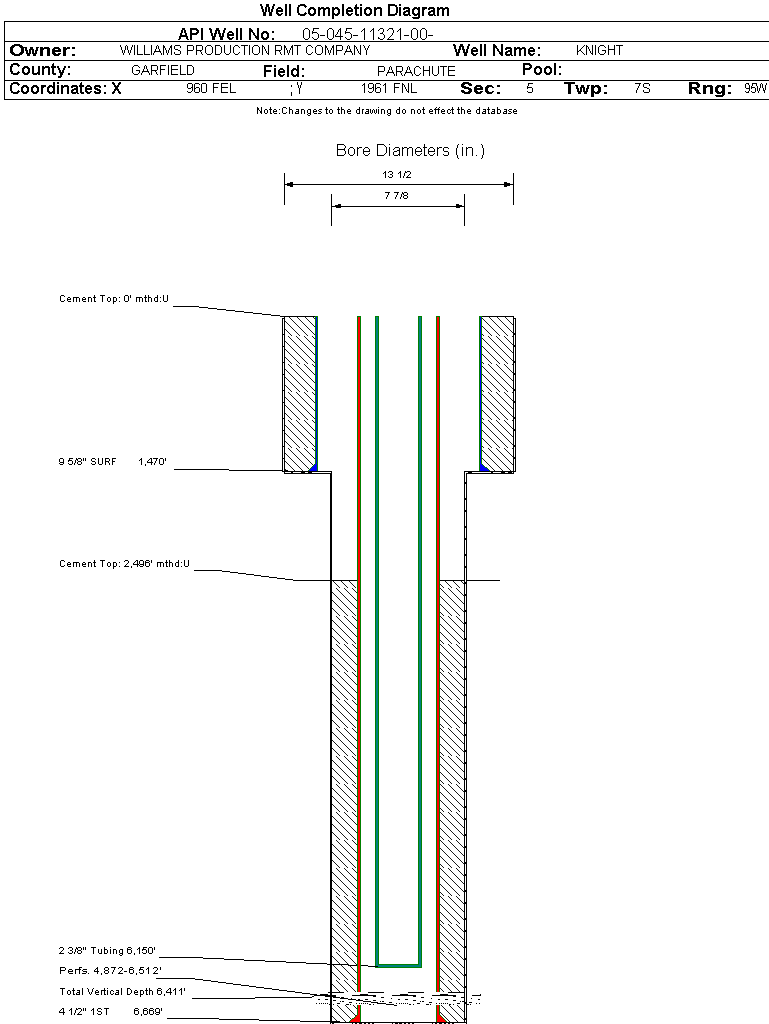 Wellbore #00 Wellbore Classification: GW Status: PR - 9/7/2005 Measured TD: 6673 ft. Vertical TD: 6411 ft.| Wellbore Data for Original Wellbore | Wellbore Classification: GW PR - 9/7/2005 | | Wellbore Permit | DIRECTIONAL | | Permit #: | 20053309 | Expiration Date: | 10/16/2006 | | Proposed Top PZ Location: | Sec:5 Twp: 7S 95W | Footage: 1785 FNL 2270 FEL | | Bottom Hole Location: | Sec:5 Twp: 7S 95W | Footage: 1785 FNL 2270 FEL | | Proposed Depth/Form: | 6691 ft. | | Surface Mineral Owner Same: | Yes | | Mineral Owner: | FEE | Surface Owner: | FEE | | Unit: | | Unit Number: | | | Formation And Spacing: | Code: WMFK , Formation: WILLIAMS FORK , Order: 440-28 , Unit Acreage: 320, Drill Unit: N2 |