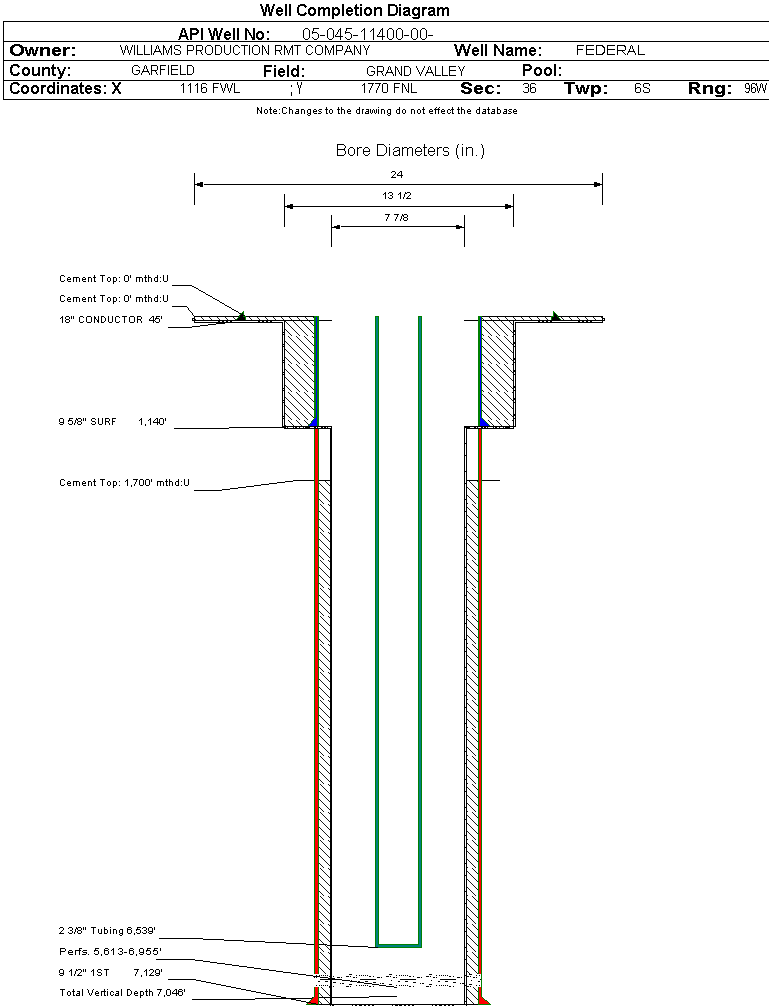 Wellbore #00 Wellbore Classification: GW Status: PR - 6/13/2007 Measured TD: 7144 ft. Vertical TD: 7046 ft.| Wellbore Data for Original Wellbore | Wellbore Classification: GW PR - 6/13/2007 | | Wellbore Permit | DIRECTIONAL | | Permit #: | 20073419 | Expiration Date: | 8/9/2008 | | Proposed Top PZ Location: | Sec: Twp: | Footage: 1217 FNL 1789 FWL | | Bottom Hole Location: | Sec:36 Twp: 6S 96W | Footage: 1217 FNL 1789 FWL | | Proposed Depth/Form: | 7159 ft. | | Surface Mineral Owner Same: | Yes | | Mineral Owner: | FEDERAL | Surface Owner: | FEDERAL | | Unit: | | Unit Number: | | | Formation And Spacing: | Code: WMFK , Formation: WILLIAMS FORK , Order: 510-9 , Unit Acreage: 160, Drill Unit: NW4 |