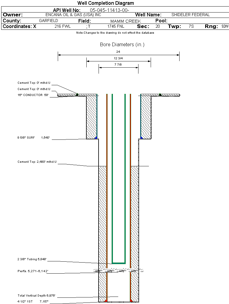 | Wellbore Completed | | Completion Date: | 1/1/2006 | | Spud Date: | 11/13/2005 | Spud Date Is: | ACTUAL | | Measured TD: | 7157 ft. | Measured PB depth: | 5410 ft. | | True Vertical TD: | 6976 ft. | True Vertical PB depth: | | | Top PZ Location: | Sec:20 Twp: 7S 92W | Footage: 593 FNL 517 FWL | | Bottom Hole Location: | Sec:20 Twp: 7S 92W | Footage: 593 FNL 517 FWL | | Log Types: | CBL, PEX-AI/GR/SP | | Casing: | String Type: CONDUCTOR, Hole Size: 24 in., Size: 16 in., Top: 0 ft., Depth: 58 ft., Weight: , Citings Type: ACTUAL | | Cement: | Sacks: 200, Top: 0 ft., Bottom: 58 ft., Determination Method: CALC | | Casing: | String Type: SURF, Hole Size: 12.75 in., Size: 8.625 in., Top: 0 ft., Depth: 1540 ft., Weight: , Citings Type: ACTUAL | | Cement: | Sacks: 1075, Top: 0 ft., Bottom: 1540 ft., Determination Method: CALC | | Casing: | String Type: 1ST, Hole Size: 7.875 in., Size: 4.5 in., Top: 0 ft., Depth: 7157 ft., Weight: , Citings Type: ACTUAL | | Cement: | Sacks: 1050, Top: 2480 ft., Bottom: 7157 ft., Determination Method: CALC | | Formation | Interval Top | Log Bottom | Cored | DSTs | | WASATCH | 0 ft. | 3946 ft. | N | N | | WILLIAMS FORK | 3947 ft. | 7050 ft. | N | N | | ROLLINS | 7051 ft. | | N | N |