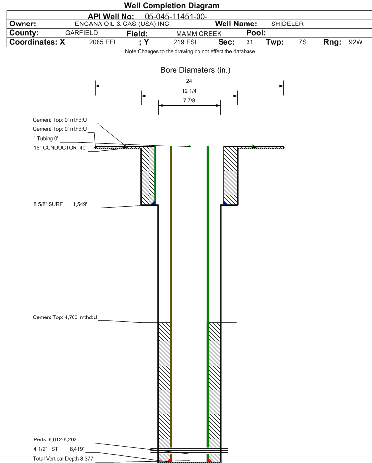 | Wellbore Completed | | Completion Date: | 1/11/2006 | | Spud Date: | 12/29/2005 | Spud Date Is: | ACTUAL | | Measured TD: | 8420 ft. | Measured PB depth: | 7620 ft. | | True Vertical TD: | 8377 ft. | True Vertical PB depth: | | | Top PZ Location: | Sec:31 Twp: 7S 92W | Footage: 377 FSL 2032 FEL | | Bottom Hole Location: | Sec:31 Twp: 7S 92W | Footage: 377 FSL 2032 FEL | | Log Types: | PEX, CBL, RST | | Casing: | String Type: CONDUCTOR, Hole Size: 24 in., Size: 16 in., Top: 0 ft., Depth: 40 ft., Weight: , Citings Type: ACTUAL | | Cement: | Sacks: 90, Top: 0 ft., Bottom: 40 ft., Determination Method: CALC | | Casing: | String Type: SURF, Hole Size: 12.25 in., Size: 8.625 in., Top: 0 ft., Depth: 1549 ft., Weight: , Citings Type: ACTUAL | | Cement: | Sacks: 1075, Top: 0 ft., Bottom: 1549 ft., Determination Method: CALC | | Casing: | String Type: 1ST, Hole Size: 7.875 in., Size: 4.5 in., Top: 0 ft., Depth: 8419 ft., Weight: , Citings Type: ACTUAL | | Cement: | Sacks: 905, Top: 4700 ft., Bottom: 8420 ft., Determination Method: CALC | | Formation | Interval Top | Log Bottom | Cored | DSTs | | WASATCH | 0 ft. | 5392 ft. | N | N | | WILLIAMS FORK | 5393 ft. | 8354 ft. | N | N | | ROLLINS | 8355 ft. | 8420 ft. | N | N |