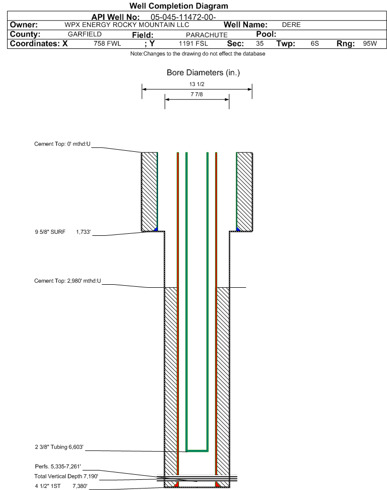 | | Perforation Data: | | Interval Top: | 5335 ft. | # Of Holes: | 107 | | Interval Bottom: | 7261 ft. | Hole Size: | 0.35 in. |