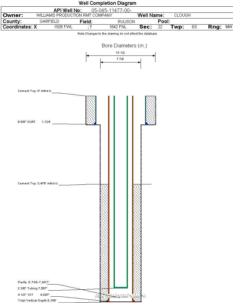 | Wellbore Completed | | Completion Date: | 4/19/2006 | | Spud Date: | 4/9/2006 | Spud Date Is: | ACTUAL | | Measured TD: | 8110 ft. | Measured PB depth: | 8050 ft. | | True Vertical TD: | 8106 ft. | True Vertical PB depth: | | | Top PZ Location: | Sec:22 Twp: 6S 94W | Footage: 1672 FNL 1884 FWL | | Bottom Hole Location: | Sec:22 Twp: 6S 94W | Footage: 1672 FNL 1884 FWL | | Log Types: | CBL; HIGH RESOLUTION INDUCTION, SPECTRAL DENSITY, DUAL SPACED NEUTRON | | Casing: | String Type: SURF, Hole Size: 13.5 in., Size: 9.625 in., Top: 0 ft., Depth: 1124 ft., Weight: , Citings Type: ACTUAL | | Cement: | Sacks: 375, Top: 0 ft., Bottom: 1124 ft., Determination Method: CALC | | Casing: | String Type: 1ST, Hole Size: 7.875 in., Size: 4.5 in., Top: 0 ft., Depth: 8097 ft., Weight: , Citings Type: ACTUAL | | Cement: | Sacks: 1000, Top: 3476 ft., Bottom: 8097 ft., Determination Method: CBL | | Formation | Interval Top | Log Bottom | Cored | DSTs | | WASATCH G | 1937 ft. | | N | N | | MESAVERDE | 4413 ft. | | N | N | | CAMEO | 7211 ft. | | N | N | | ROLLINS | 8086 ft. | | N | N |
