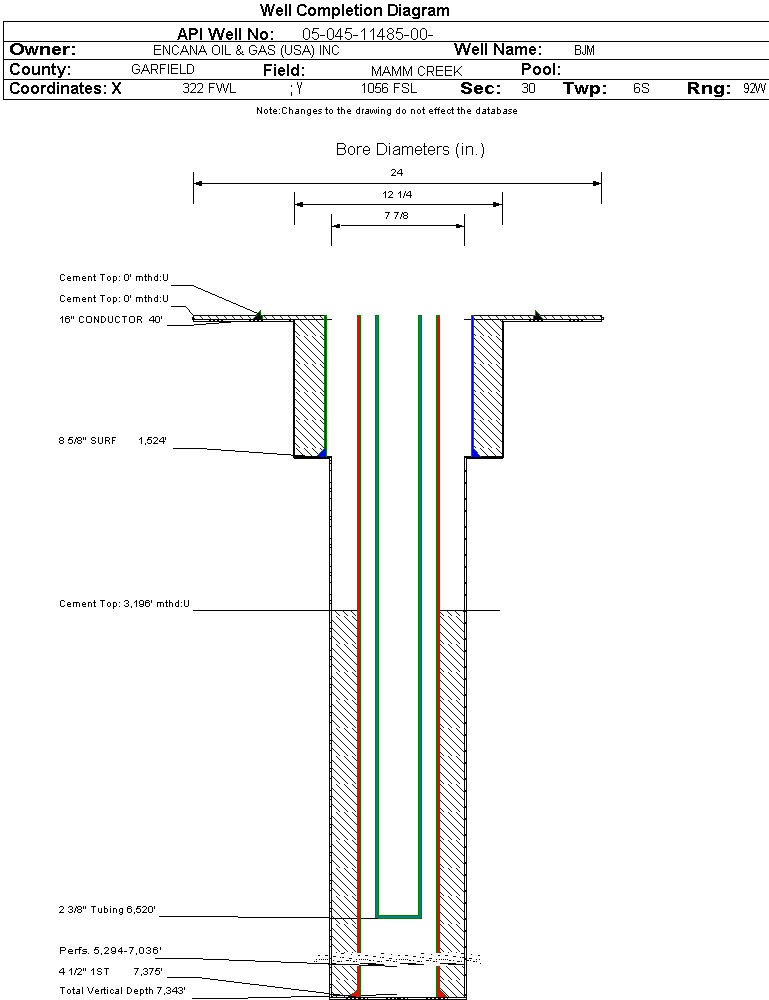 | Wellbore Completed | | Completion Date: | 4/13/2006 | | Spud Date: | 12/27/2005 | Spud Date Is: | ACTUAL | | Measured TD: | 7375 ft. | Measured PB depth: | 7260 ft. | | True Vertical TD: | 7343 ft. | True Vertical PB depth: | | | Top PZ Location: | Sec:30 Twp: 6S 92W | Footage: 1234 FSL 744 FWL | | Bottom Hole Location: | Sec:30 Twp: 6S 92W | Footage: 1234 FSL 744 FWL | | Log Types: | RST, CBL | | Casing: | String Type: CONDUCTOR, Hole Size: 24 in., Size: 16 in., Top: 0 ft., Depth: 40 ft., Weight: , Citings Type: ACTUAL | | Cement: | Sacks: , Top: 0 ft., Bottom: 40 ft., Determination Method: CALC | | Casing: | String Type: SURF, Hole Size: 12.25 in., Size: 8.625 in., Top: 0 ft., Depth: 1524 ft., Weight: , Citings Type: ACTUAL | | Cement: | Sacks: 850, Top: 0 ft., Bottom: 1514 ft., Determination Method: CALC | | Casing: | String Type: 1ST, Hole Size: 7.875 in., Size: 4.5 in., Top: 0 ft., Depth: 7375 ft., Weight: , Citings Type: ACTUAL | | Cement: | Sacks: 975, Top: 3196 ft., Bottom: 7375 ft., Determination Method: CALC | | Formation | Interval Top | Log Bottom | Cored | DSTs | | WASATCH | 0 ft. | 4167 ft. | N | N | | WILLIAMS FORK | 4168 ft. | 7261 ft. | N | N | | ROLLINS | 7262 ft. | 7375 ft. | N | N |
