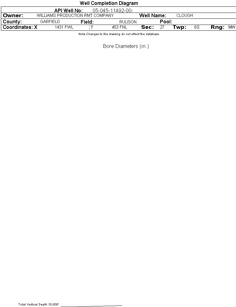 Wellbore #00 Wellbore Classification: Status: AL - 6/6/2011 Measured TD: | Wellbore Data for Original Wellbore | Wellbore Classification: AL - 6/6/2011 | | Wellbore Permit | DIRECTIONAL | | Permit #: | 20083469 | Expiration Date: | 7/16/2009 | | Proposed Top PZ Location: | Sec: Twp: | Footage: 751 FNL 784 FWL | | Bottom Hole Location: | Sec:27 Twp: 6S 94W | Footage: 751 FNL 784 FWL | | Proposed Depth/Form: | 7625 ft. | | Surface Mineral Owner Same: | No | | Mineral Owner: | FEDERAL | Surface Owner: | FEE | | Unit: | | Unit Number: | | | Formation And Spacing: | Code: WMFK , Formation: WILLIAMS FORK , Order: 479-14 , Unit Acreage: 320, Drill Unit: W/2 | | Casing: | String Type: CONDUCTOR, Hole Size: 22 in., Size: 18 in., Top: , Depth: 80 ft., Weight: , Citings Type: PLANNED | | Cement: | Sacks: , Top: 0 ft., Bottom: 80 ft. | | Casing: | String Type: SURF, Hole Size: 13.5 in., Size: 9.625 in., Top: , Depth: 1105 ft., Weight: 32.3 , Citings Type: PLANNED | | Cement: | Sacks: 493, Top: 0 ft., Bottom: 1105 ft. | | Casing: | String Type: 1ST, Hole Size: 7.875 in., Size: 4.5 in., Top: , Depth: 7625 ft., Weight: 11.6 , Citings Type: PLANNED | | Cement: | Sacks: 200, Top: , Bottom: |