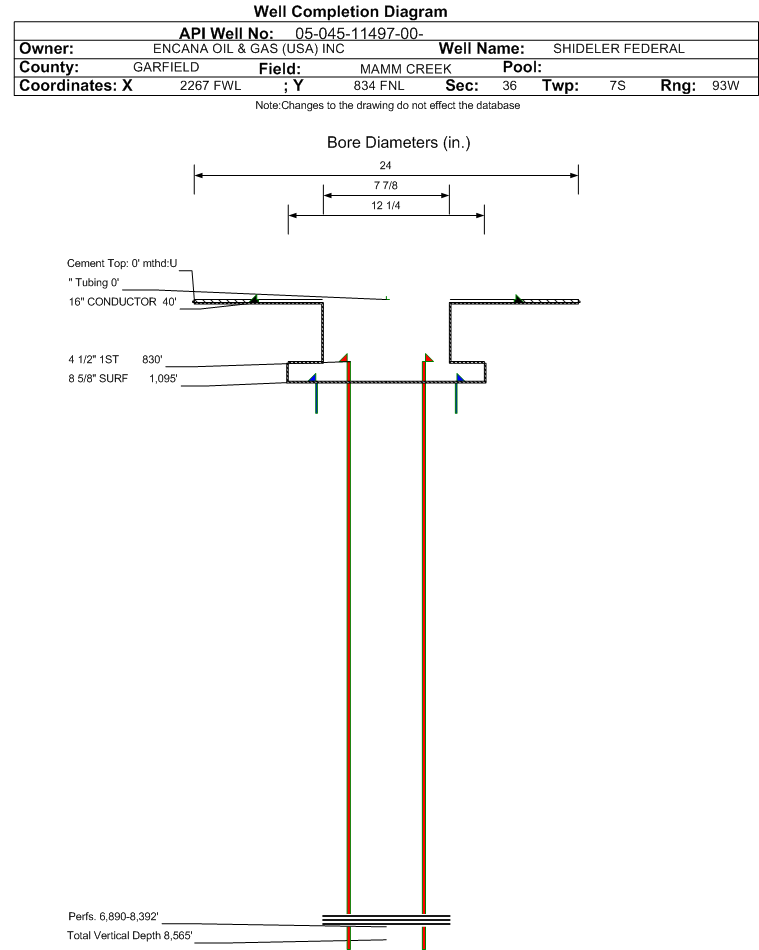 | Wellbore Completed | | Completion Date: | N/A | | Spud Date: | 1/15/2006 | Spud Date Is: | ACTUAL | | Measured TD: | 8696 ft. | Measured PB depth: | 8260 ft. | | True Vertical TD: | 8565 ft. | True Vertical PB depth: | | | Top PZ Location: | Sec:36 Twp: 7S 93W | Footage: 1835 FNL 1937 FWL | | Bottom Hole Location: | Sec:36 Twp: 7S 93W | Footage: 1835 FNL 1937 FWL | | Log Types: | CBL, PLATFORM EXPRESS | | Casing: | String Type: CONDUCTOR, Hole Size: 24 in., Size: 16 in., Top: , Depth: 40 ft., Weight: , Citings Type: ACTUAL | | Cement: | Sacks: , Top: 0 ft., Bottom: 40 ft., Determination Method: CALC | | Casing: | String Type: SURF, Hole Size: 12.25 in., Size: 8.625 in., Top: 1523 ft., Depth: 1095 ft., Weight: 0 , Citings Type: ACTUAL | | Cement: | Sacks: 0, Top: 1523 ft., Bottom: , Determination Method: CALC | | Casing: | String Type: 1ST, Hole Size: 7.875 in., Size: 4.5 in., Top: 8696 ft., Depth: 830 ft., Weight: 0 , Citings Type: ACTUAL | | Cement: | Sacks: 4300, Top: 8696 ft., Bottom: , Determination Method: CALC | | Formation | Interval Top | Log Bottom | Cored | DSTs | | WASATCH | 0 ft. | 5583 ft. | N | N | | WILLIAMS FORK | 5584 ft. | 8582 ft. | N | N | | ROLLINS | 8583 ft. | 8696 ft. | N | N |
